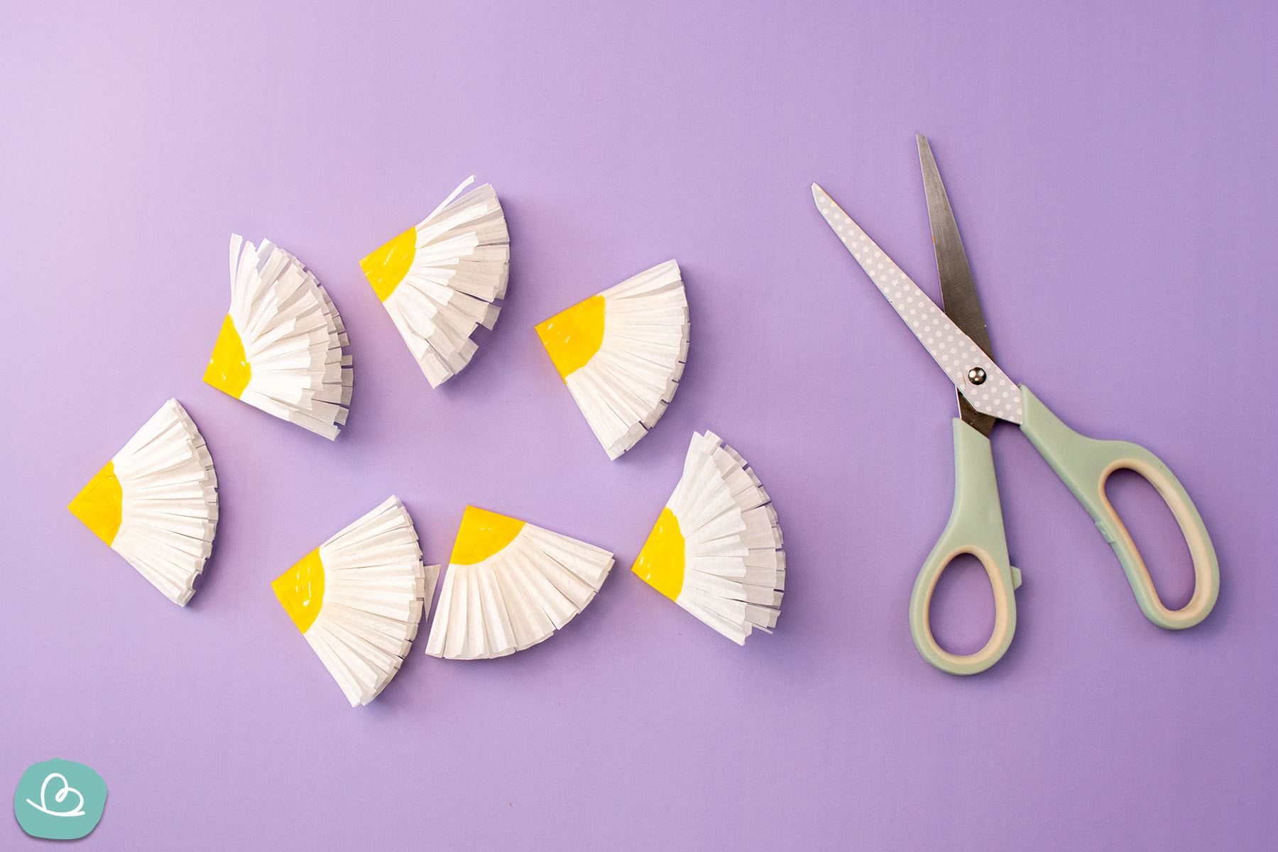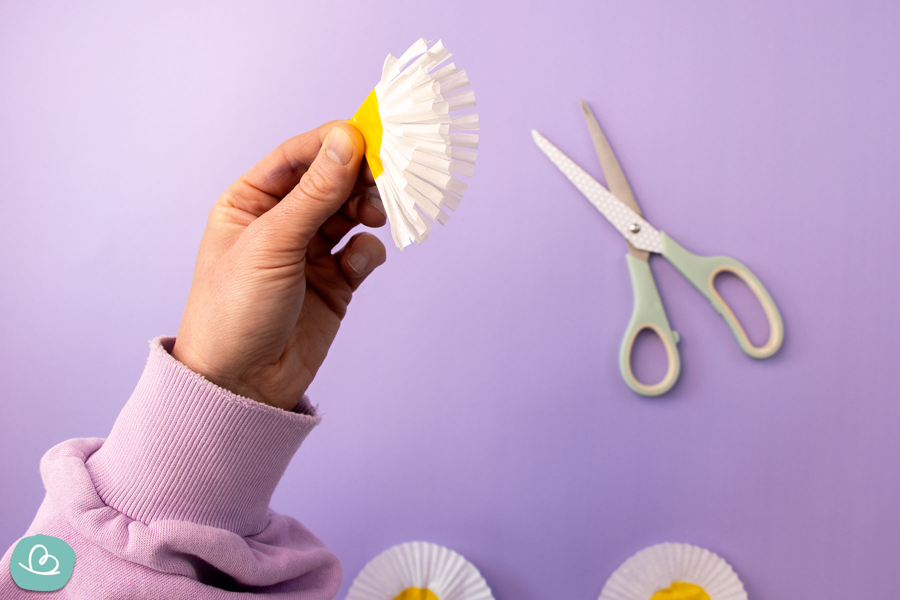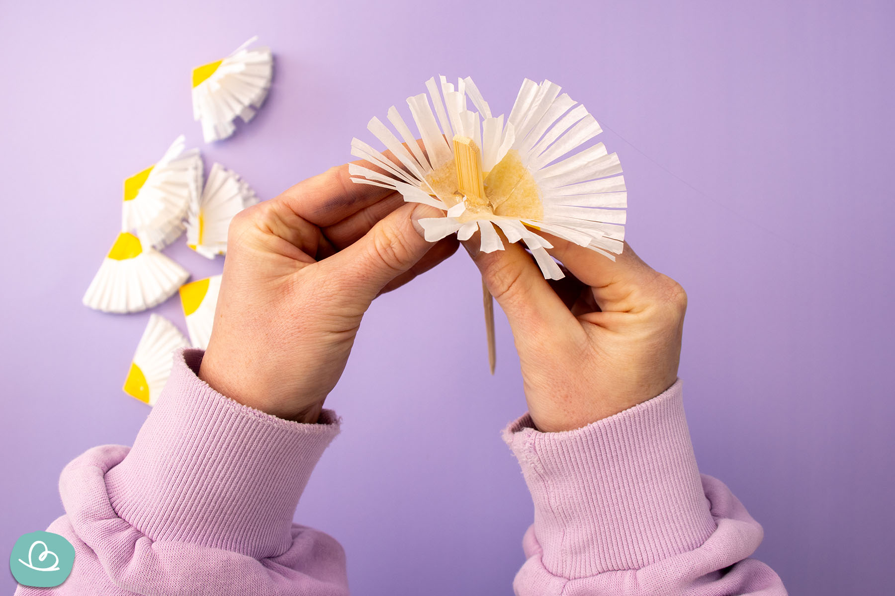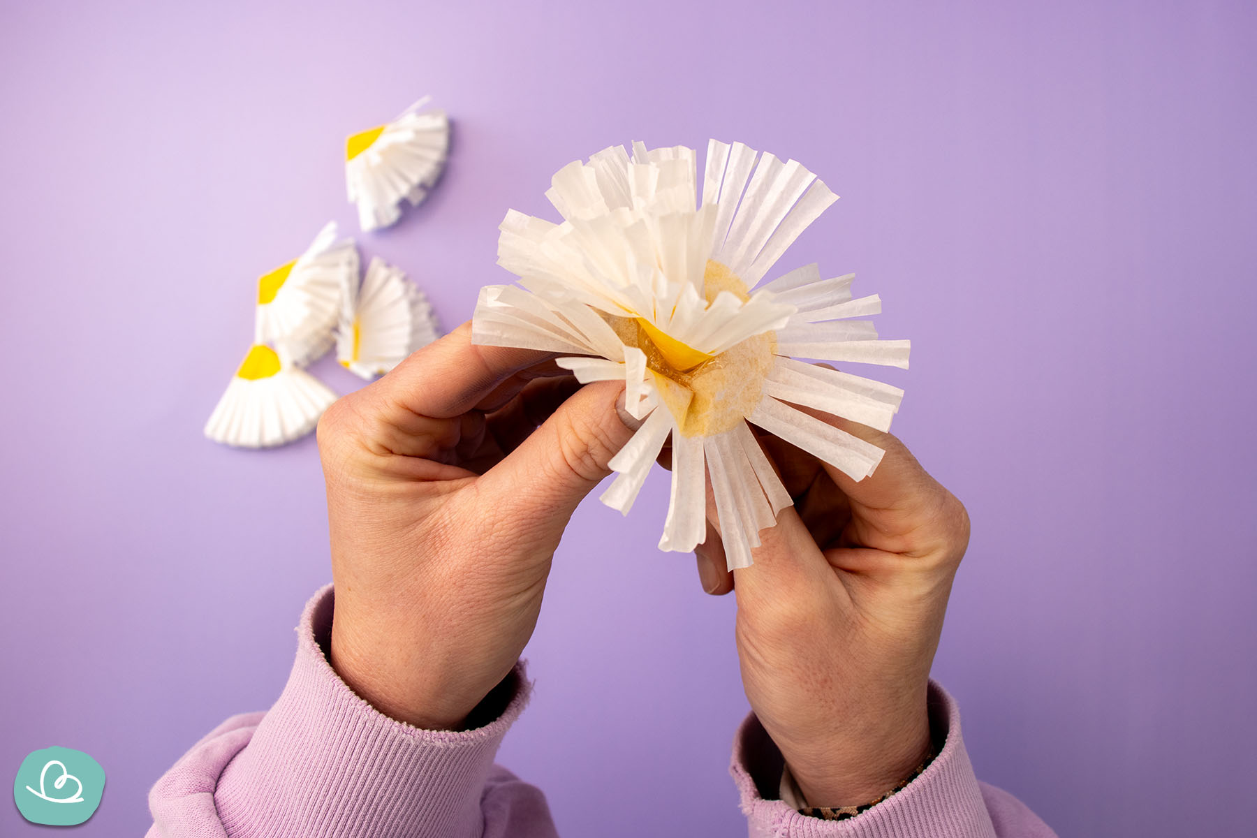 Und schon ist die Blume fertig. Das geht so schnell und einfach, dass es nicht nur Kindern Spaß macht, diese schönen Gänseblümchen zu basteln.