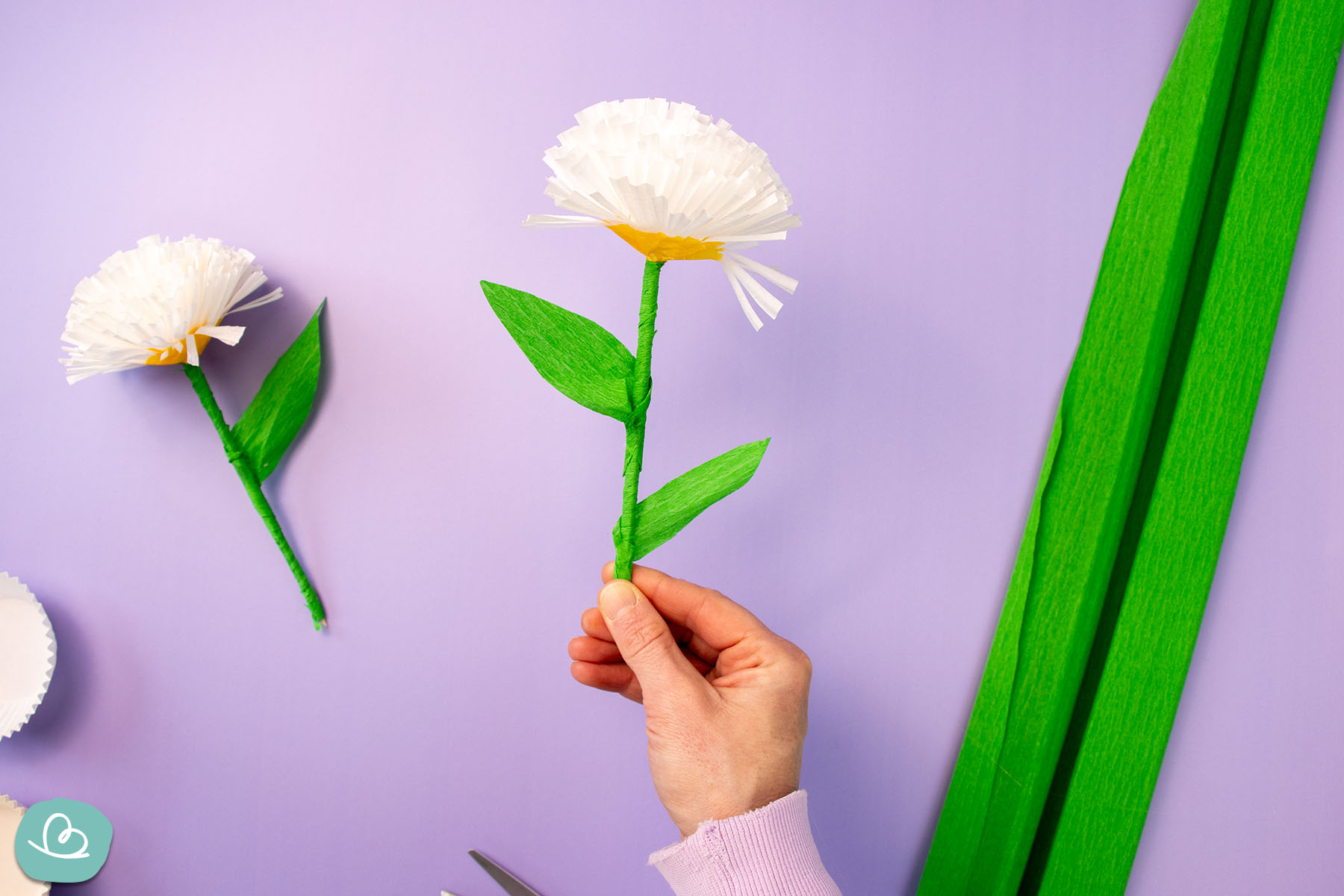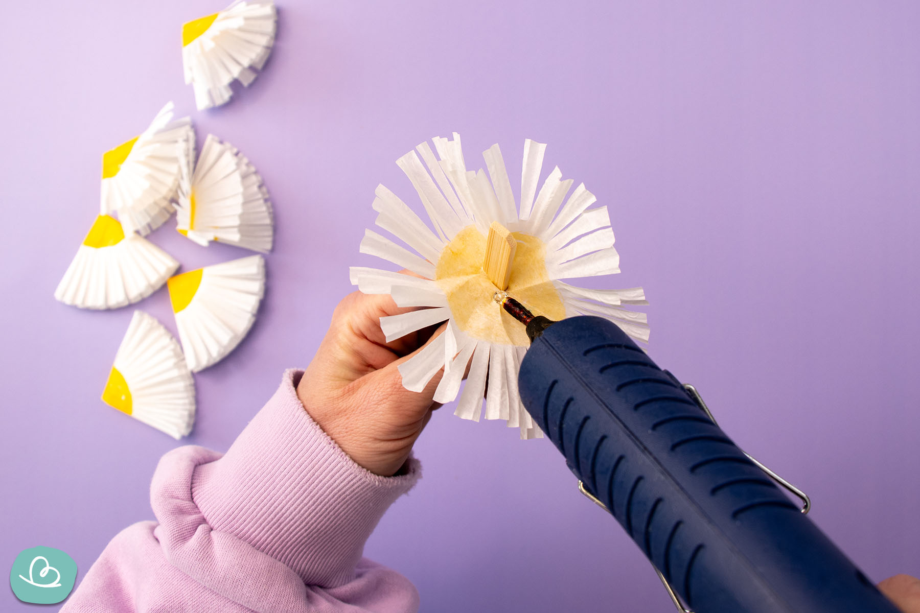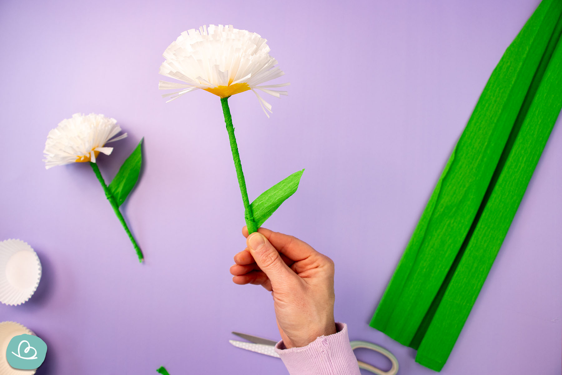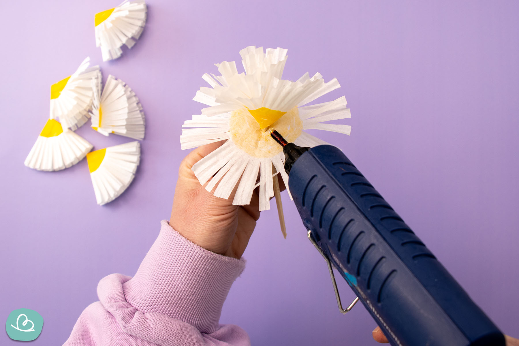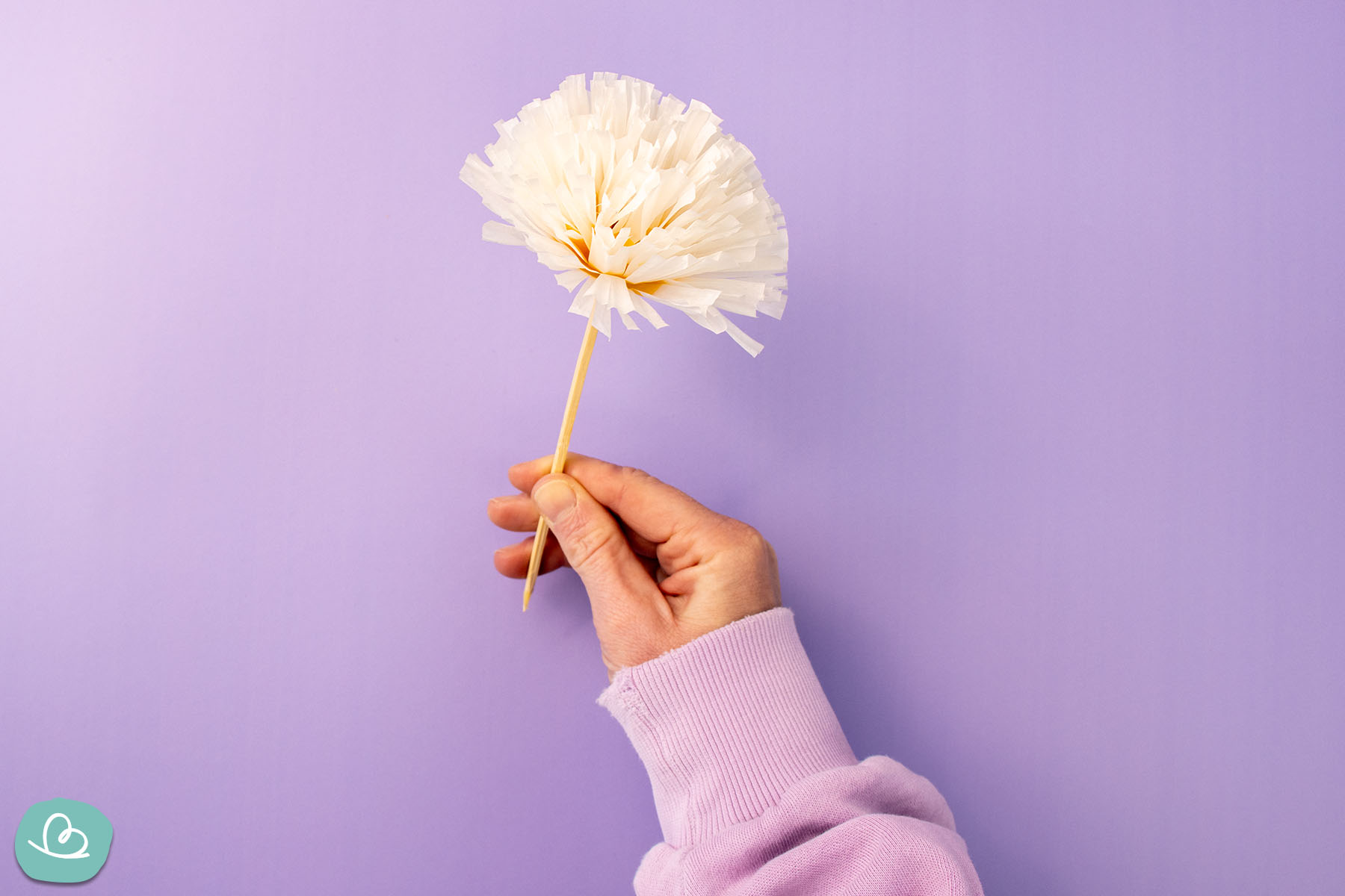Und schon ist die Blume fertig. Das geht so schnell und einfach, dass es nicht nur Kindern Spaß macht, diese schönen Gänseblümchen zu basteln.