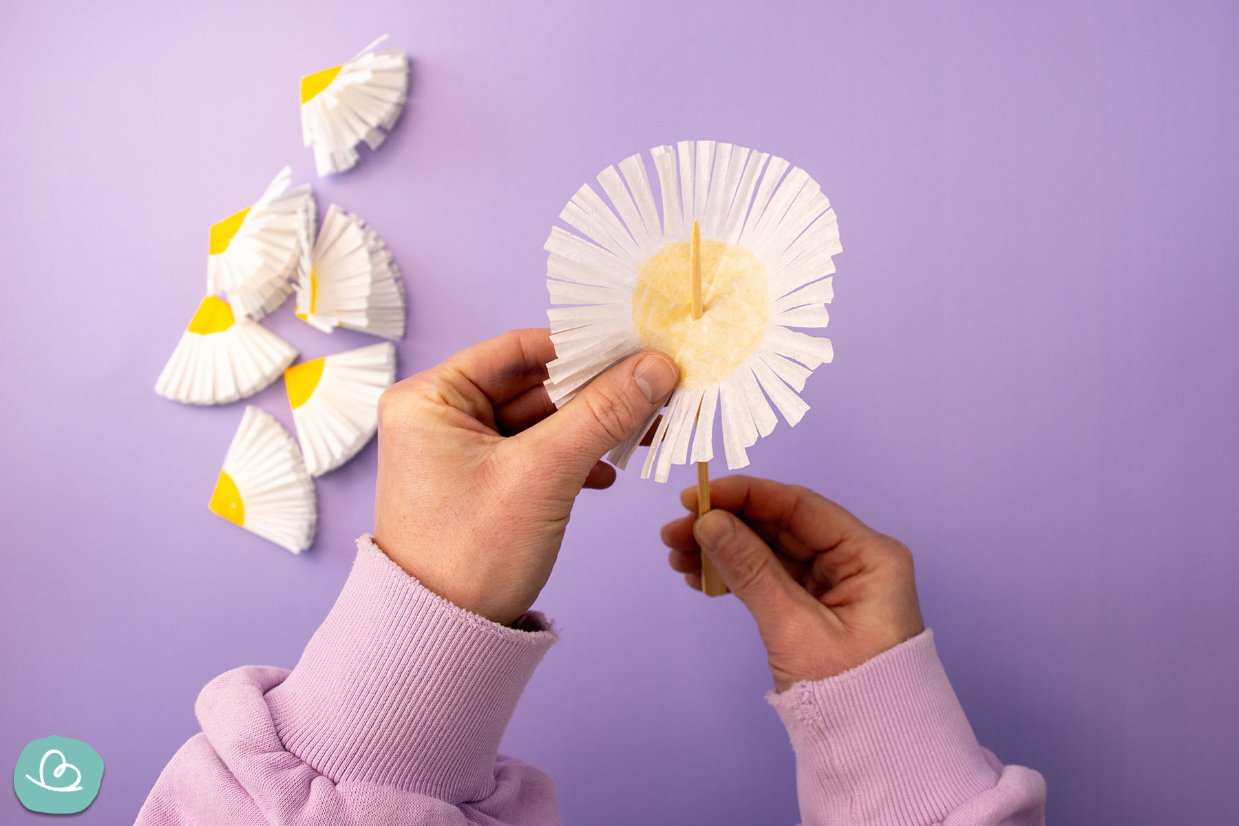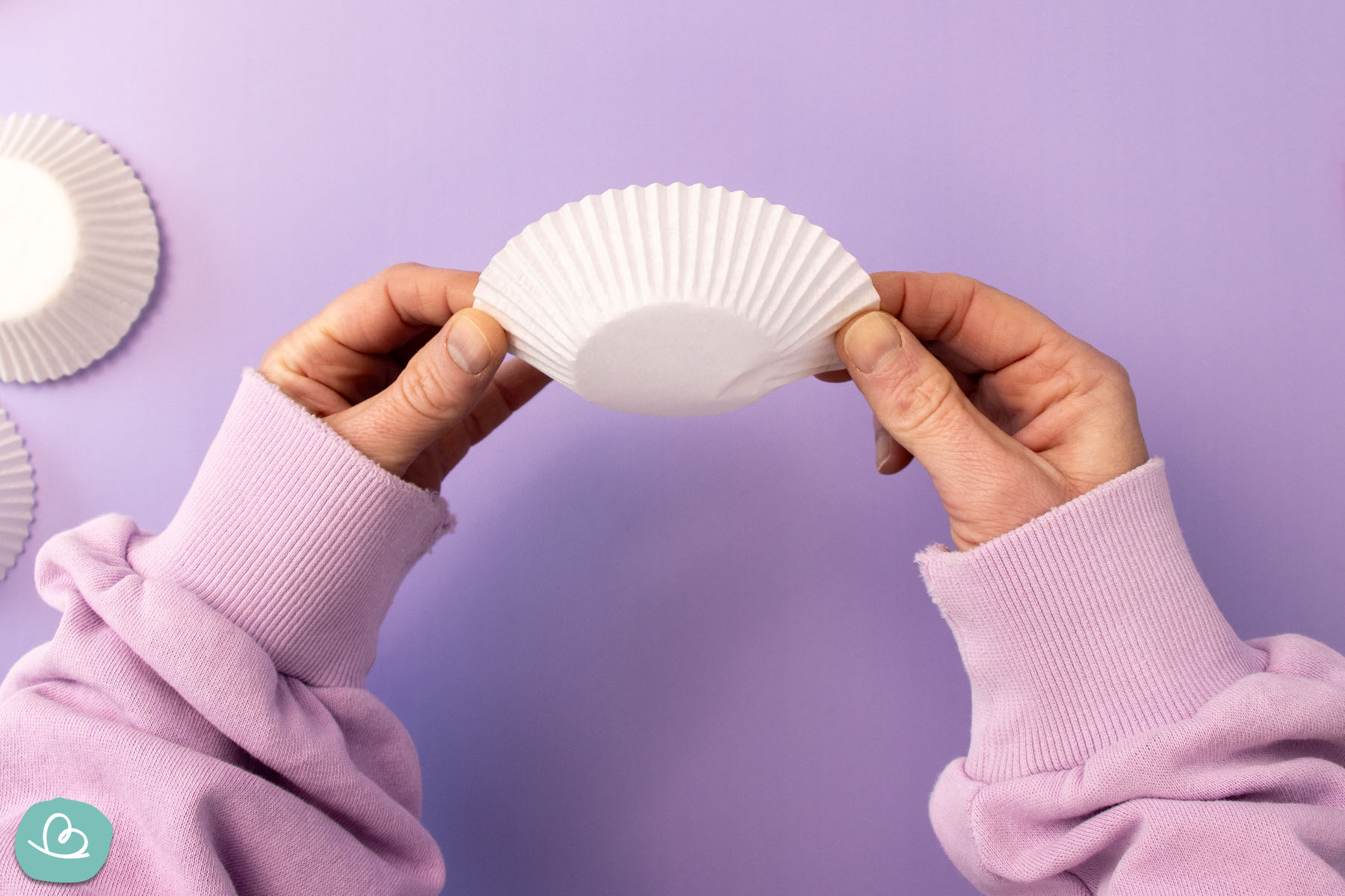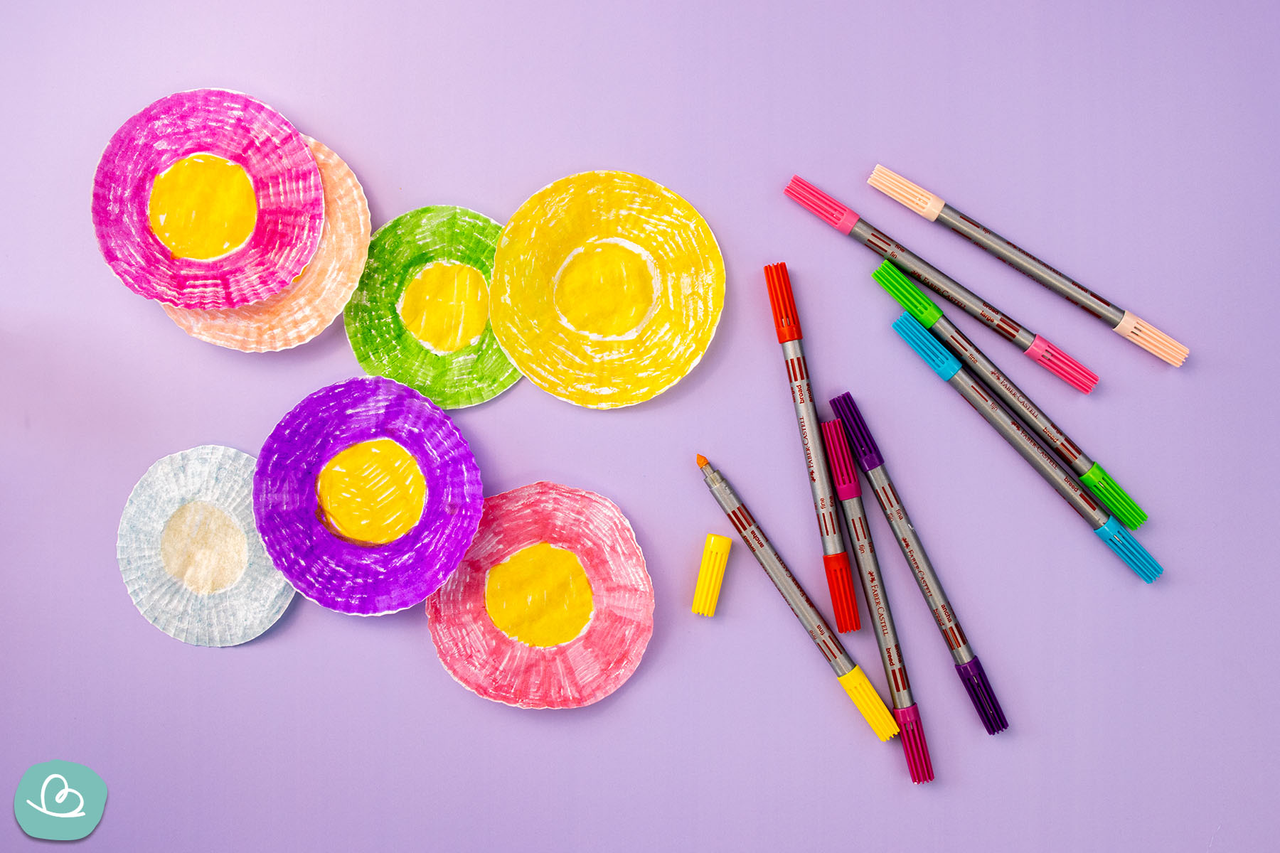 Du kannst die Blume auch aus bunten Muffinförmchen herstellen. Wenn du nur weiße Förmchen zur Hand hast, kannst du die weißen Flächen auch mit Filzstiften bemalen.