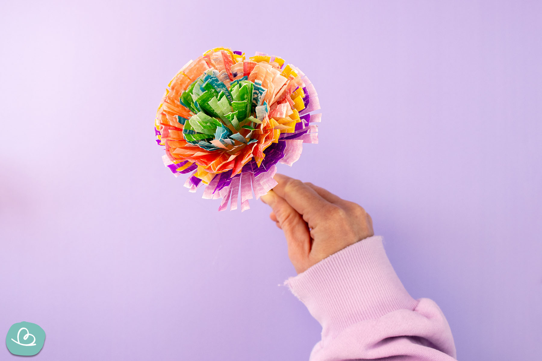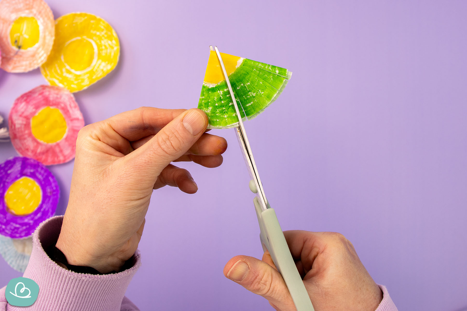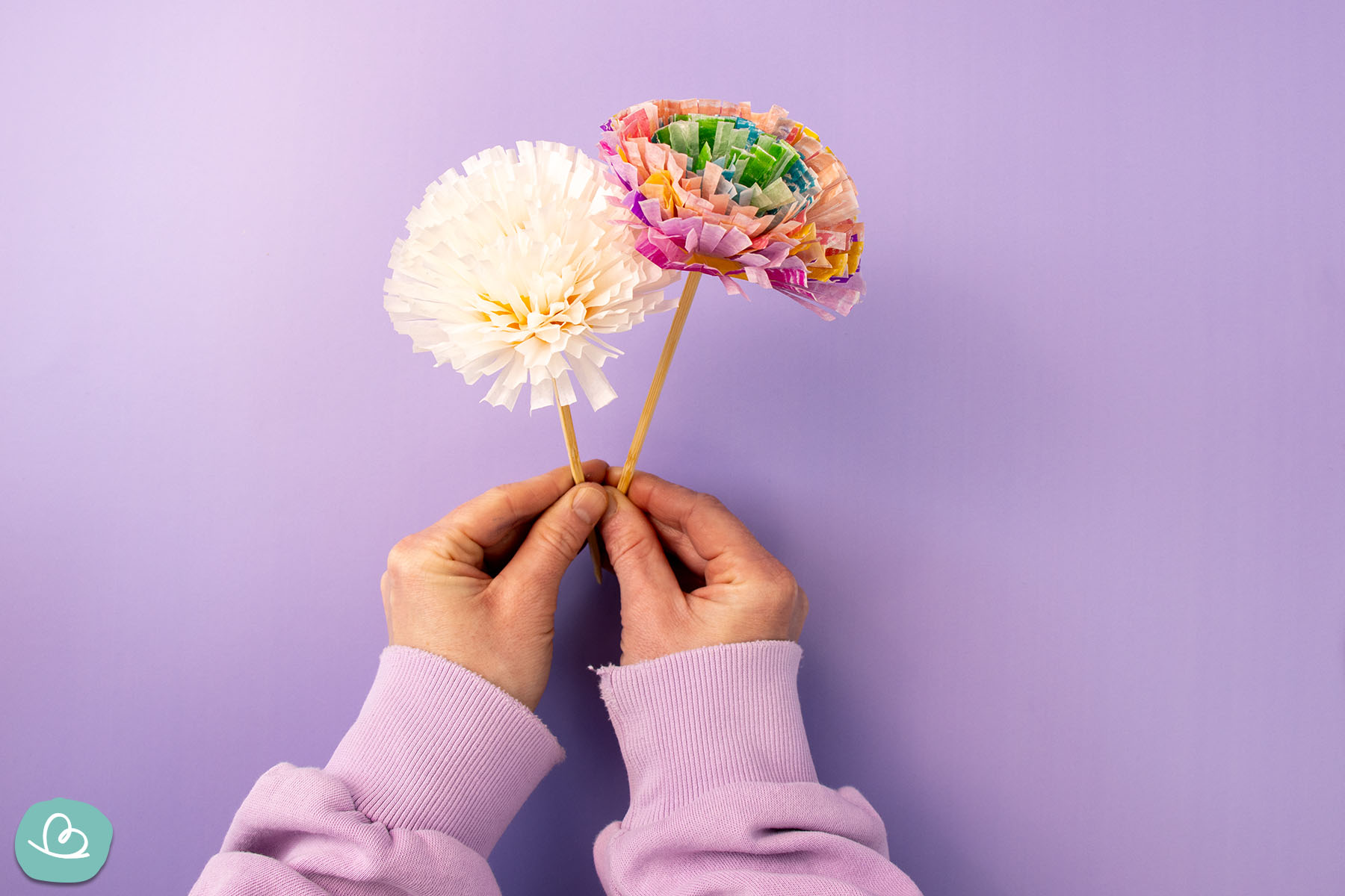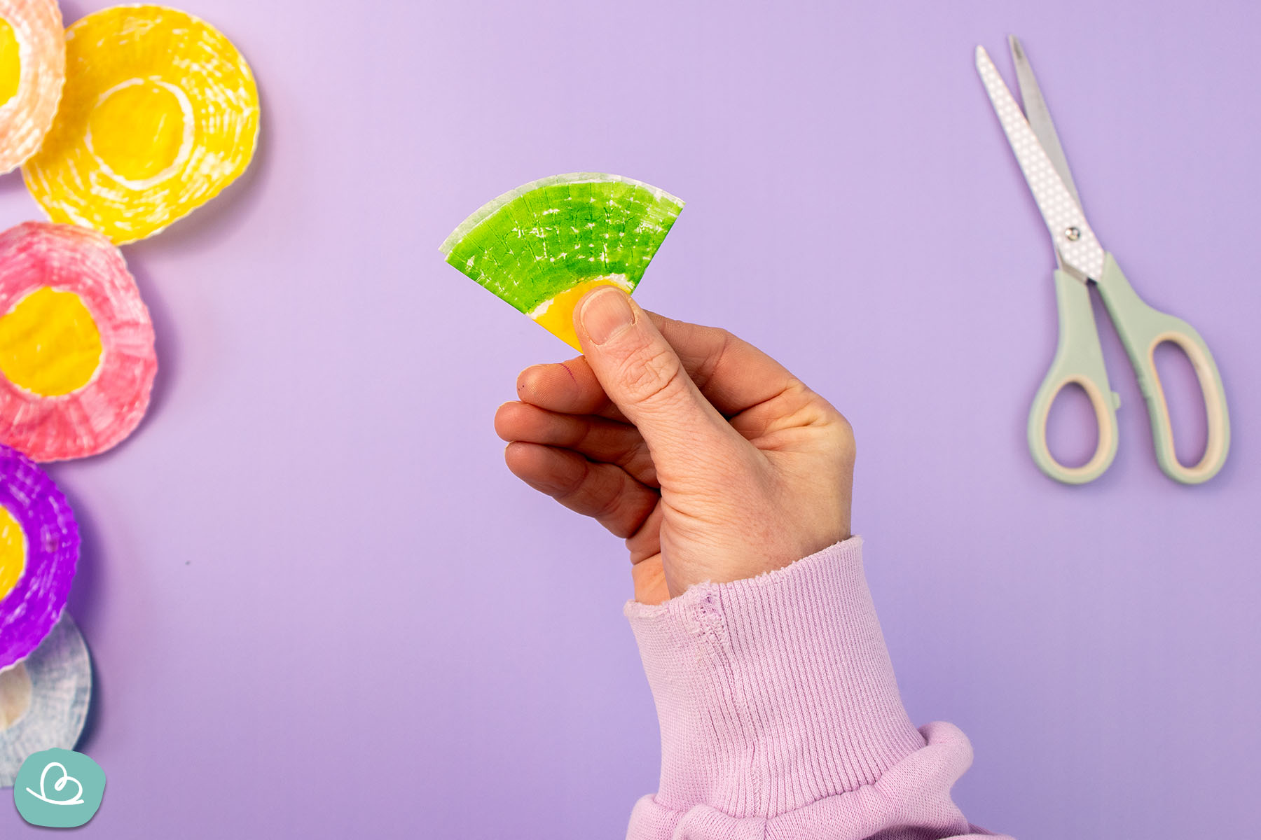 Du kannst die Blume auch aus bunten Muffinförmchen herstellen. Wenn du nur weiße Förmchen zur Hand hast, kannst du die weißen Flächen auch mit Filzstiften bemalen.