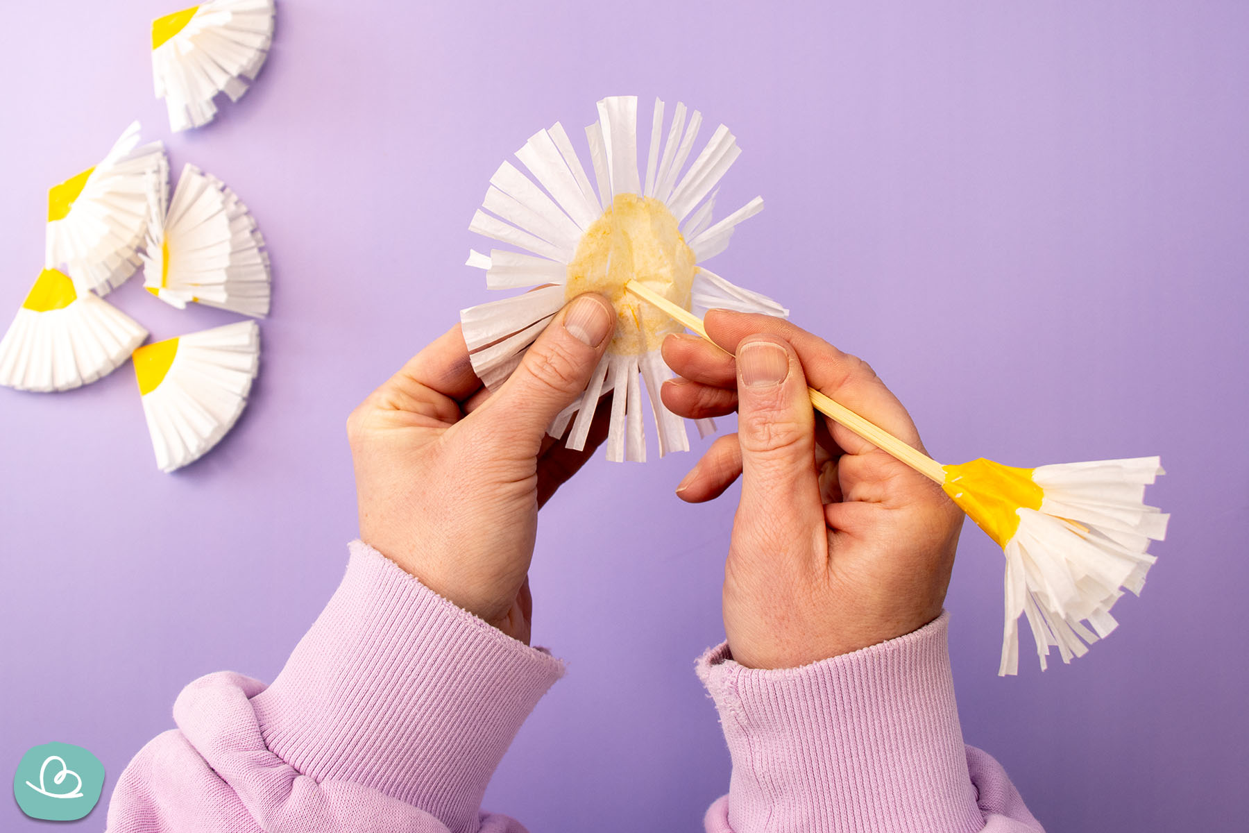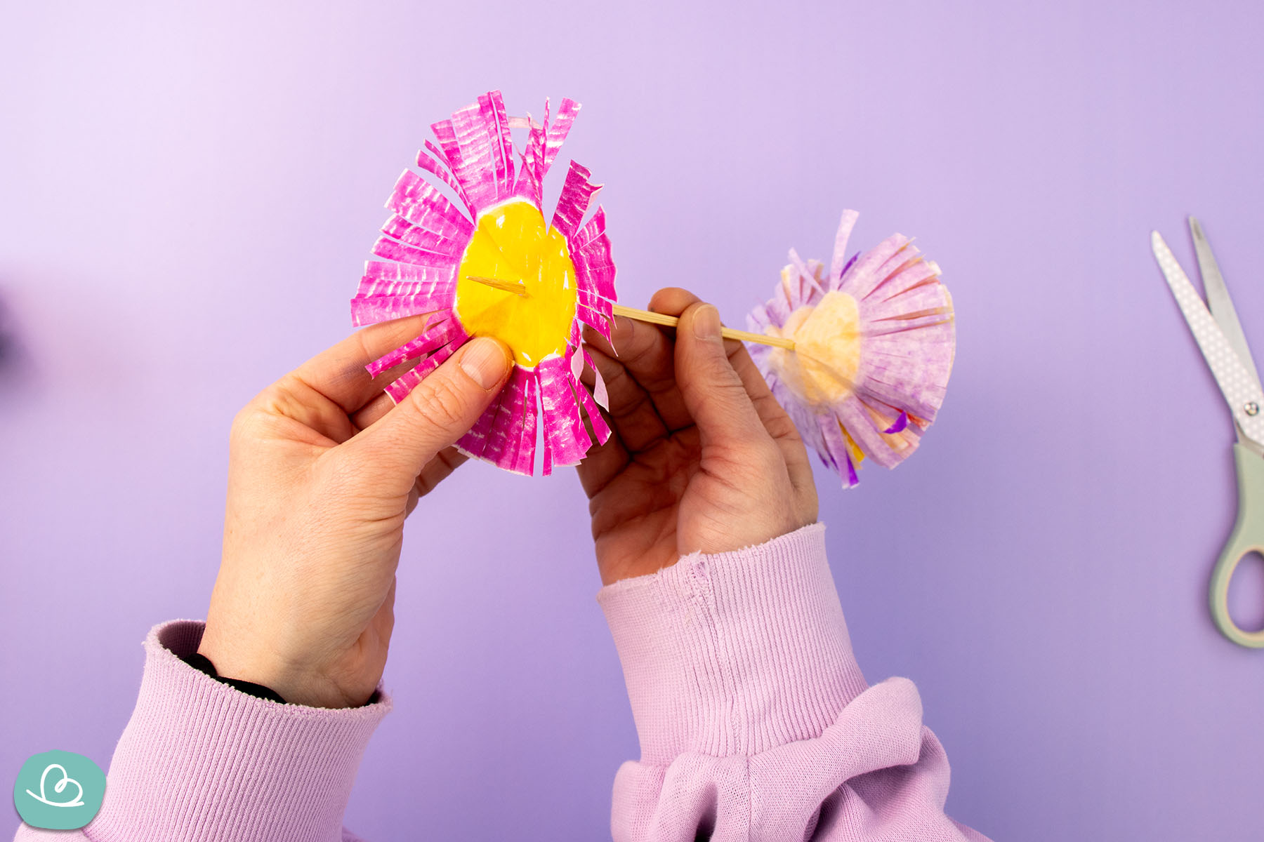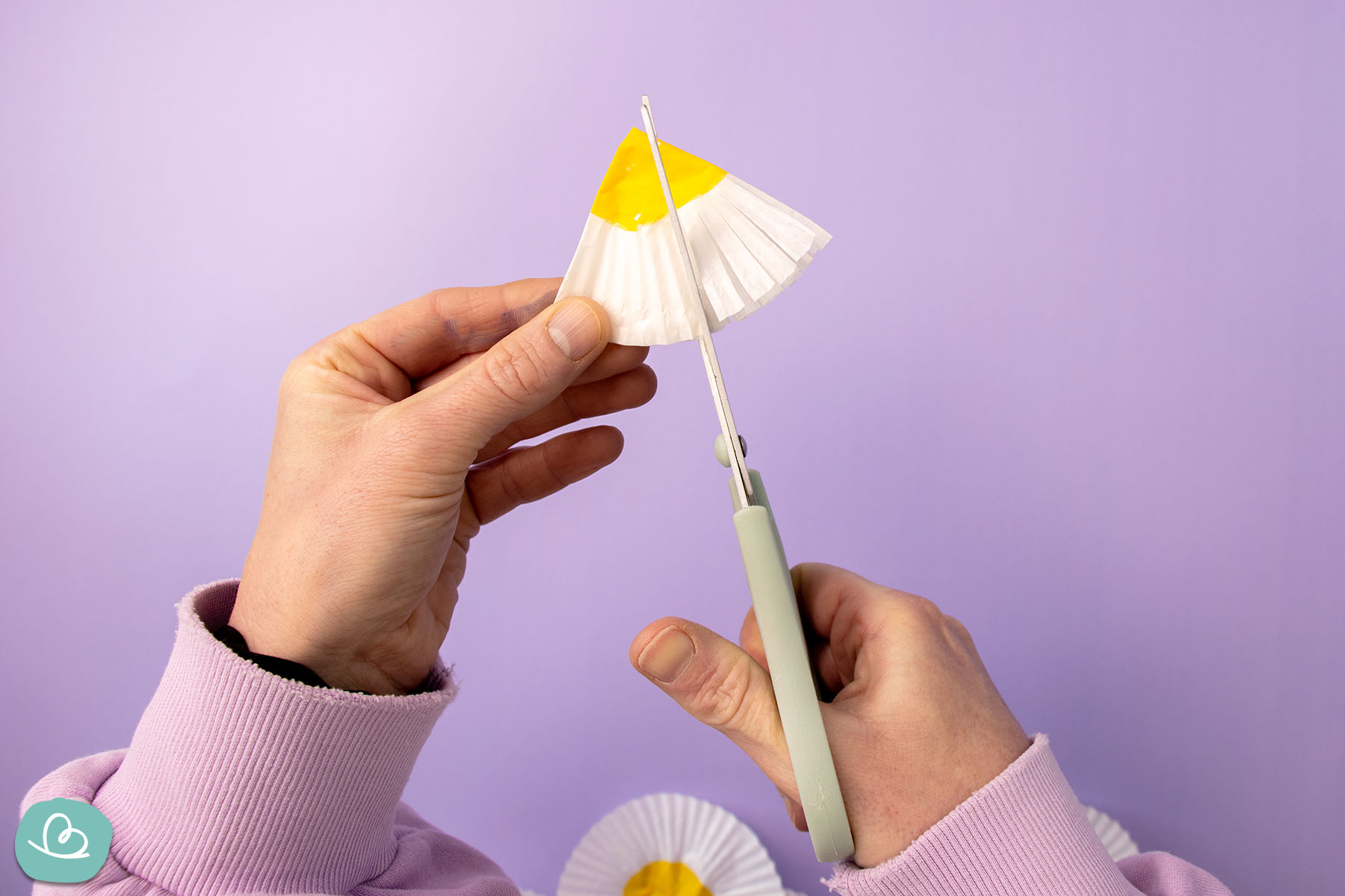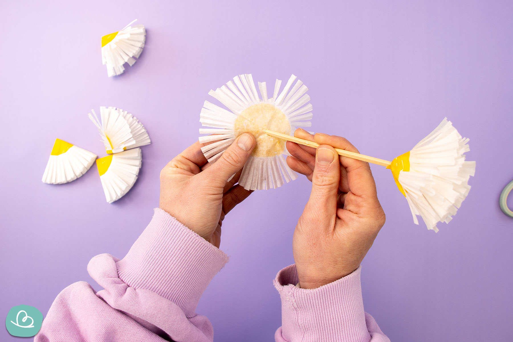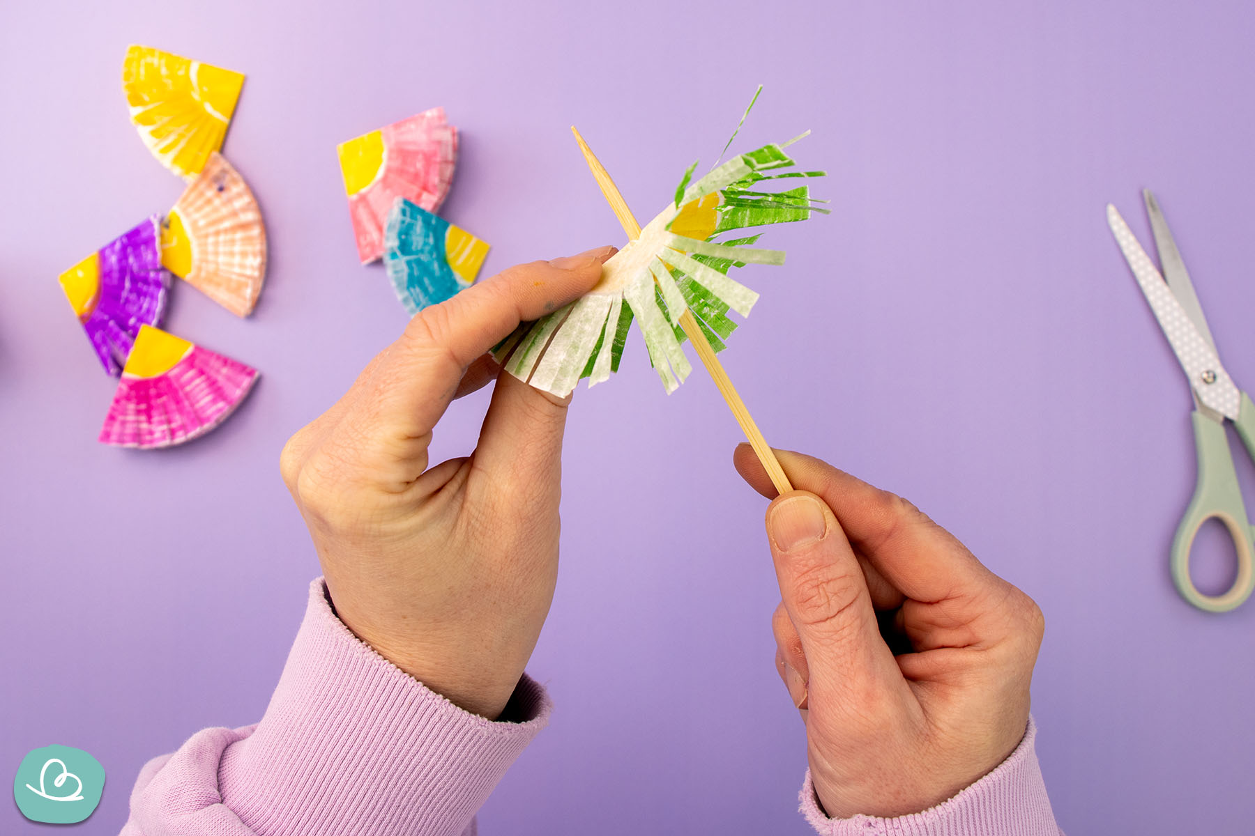 Nun die Förmchen auseinanderfalten und das erste Muffinförmchen mit der farbigen Seite nach außen auf das Holzstäbchen schieben. Lasse ca. 2 cm überstehen und klebe das Förmchen mit Heißkleber fest. Während der Kleber fest wird, faltest du das eingeschnittene Papier, um das Holzstäbchen.