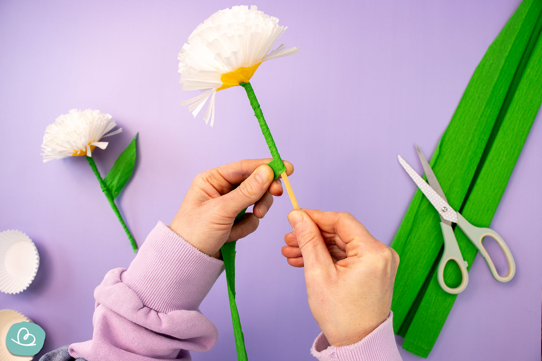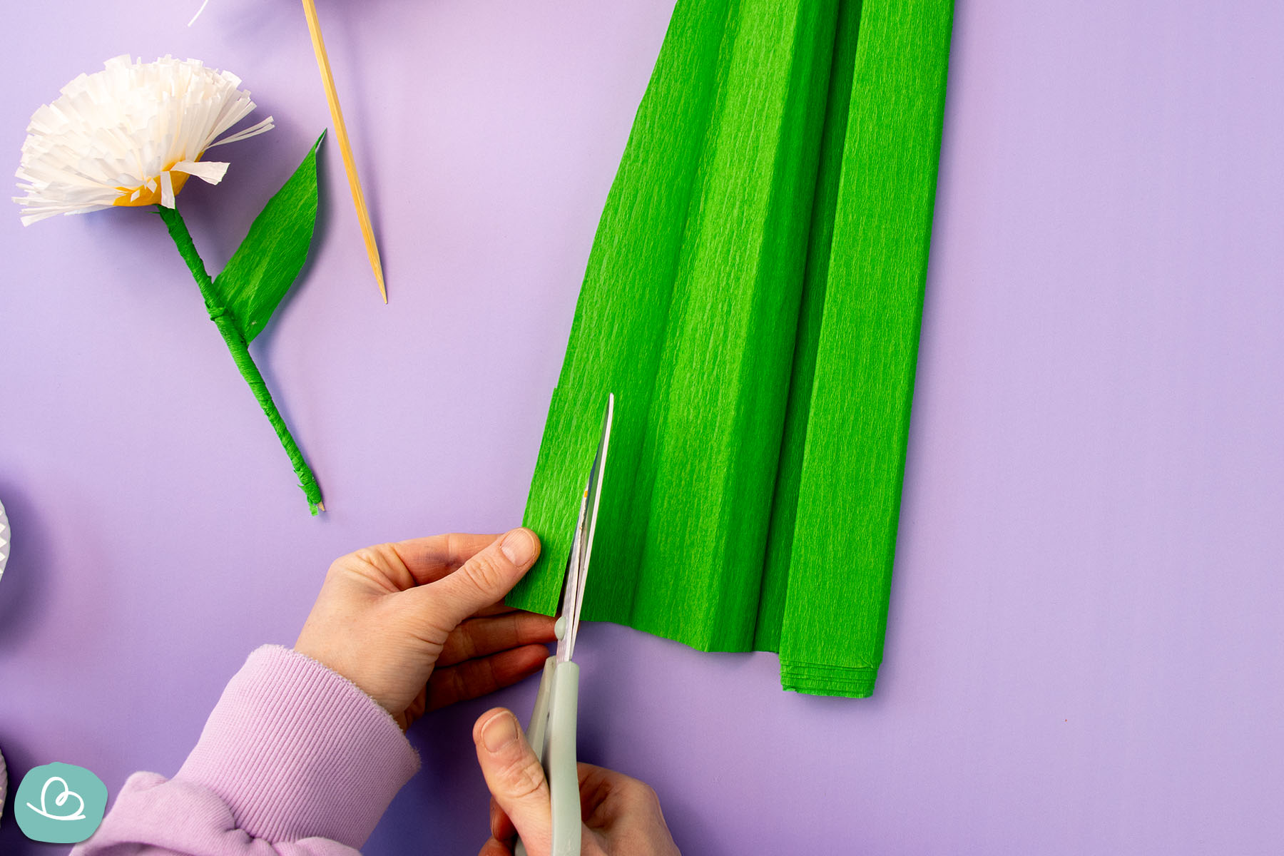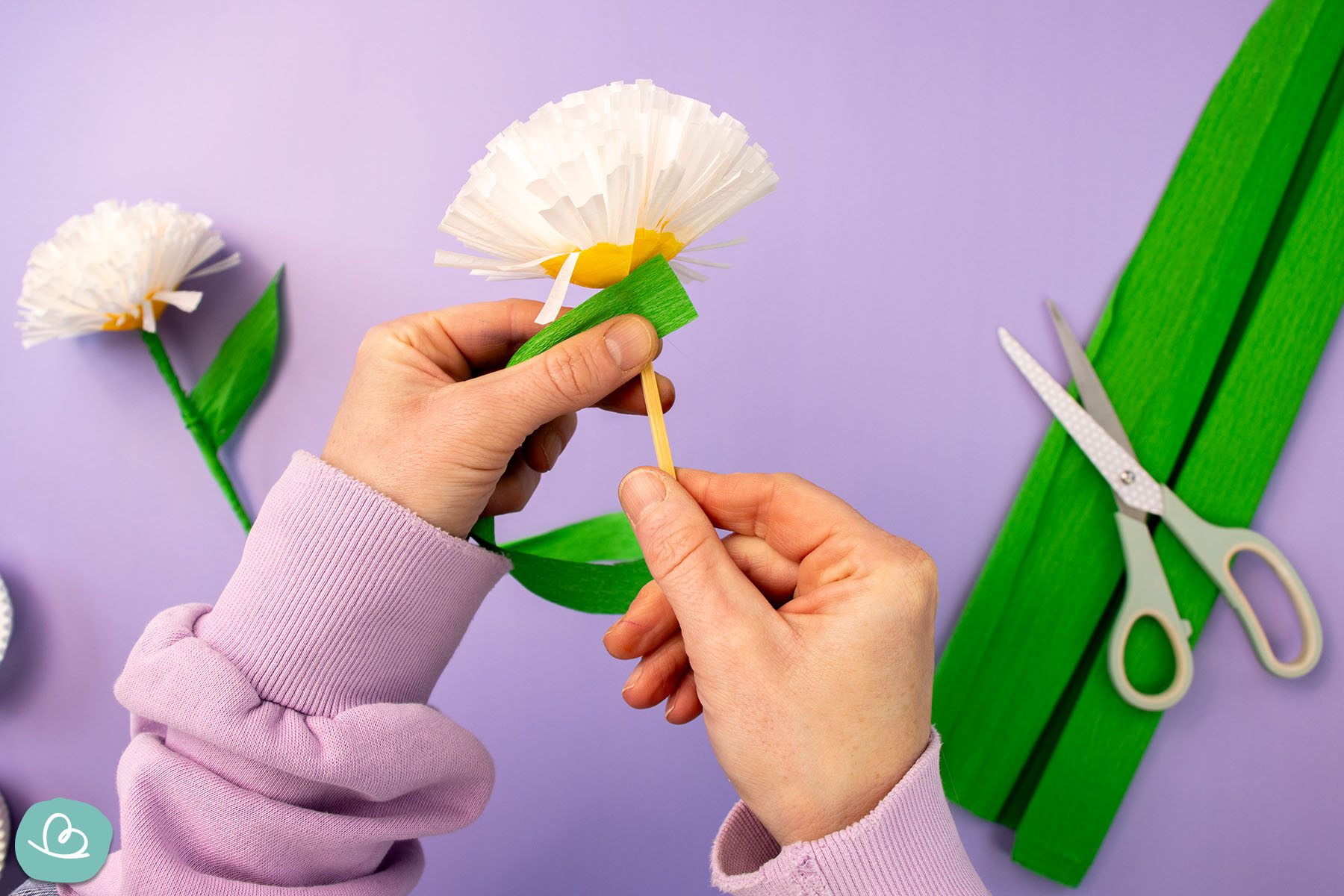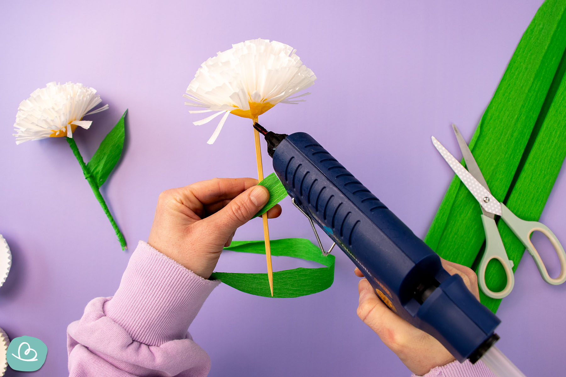 Zum Schluss schneidest du aus einem Stück Krepppapier einen Streifen aus und klebst ihn um den Holzstab.