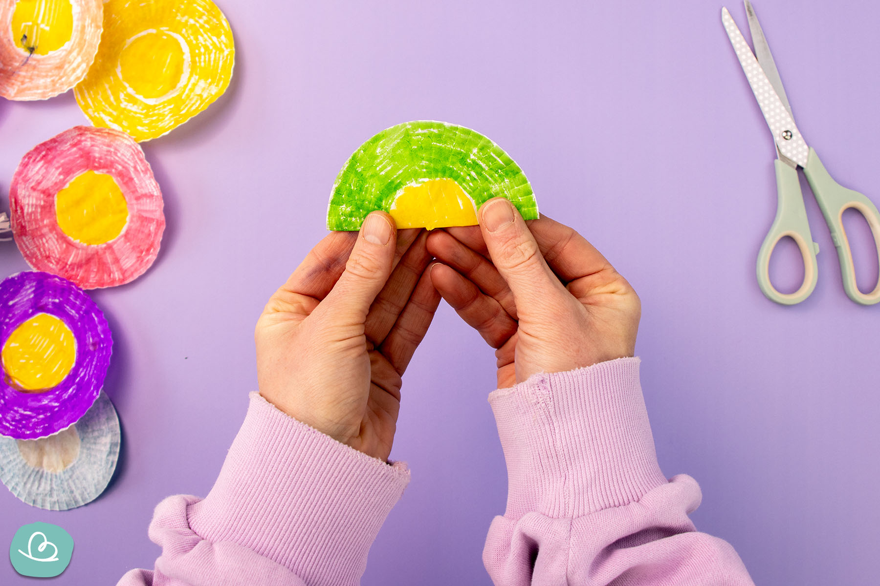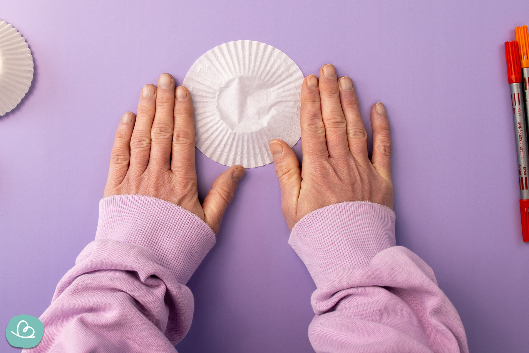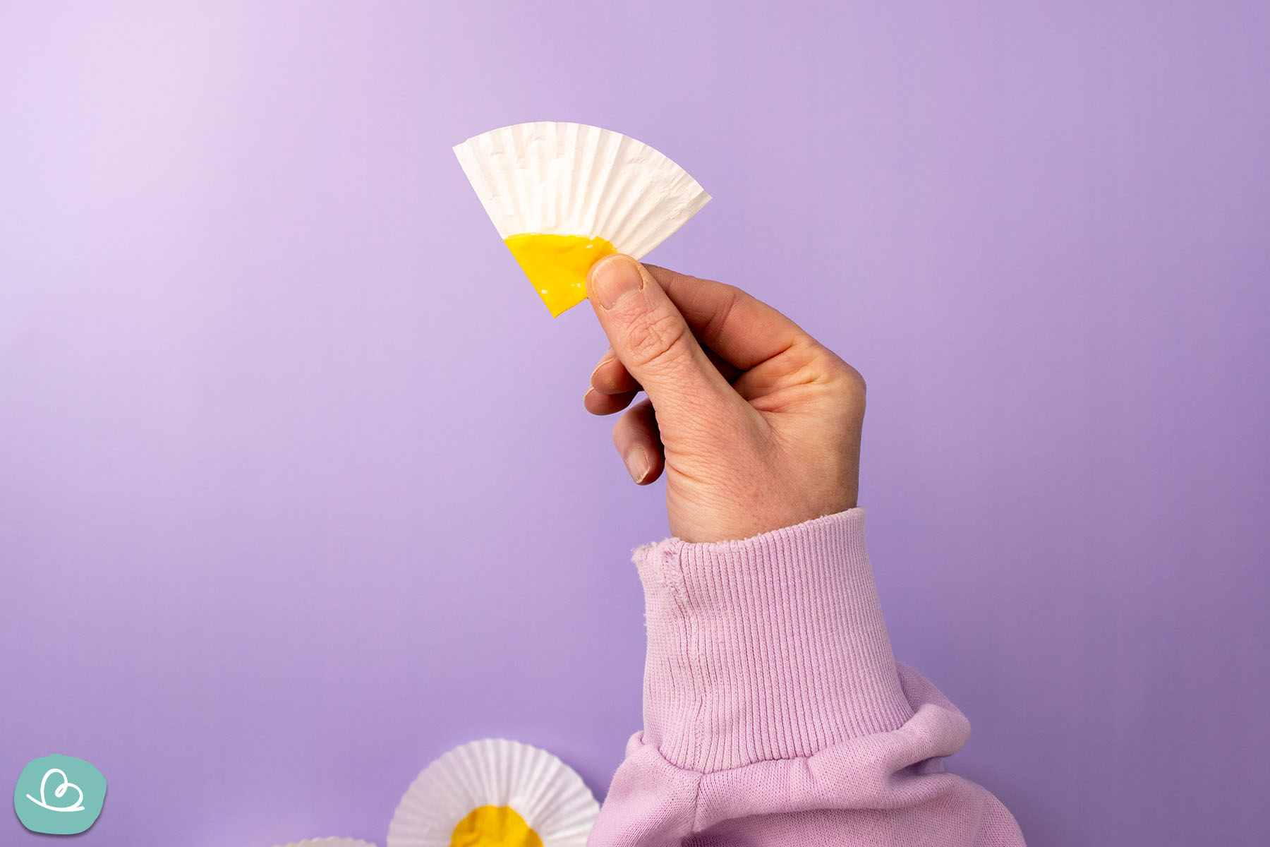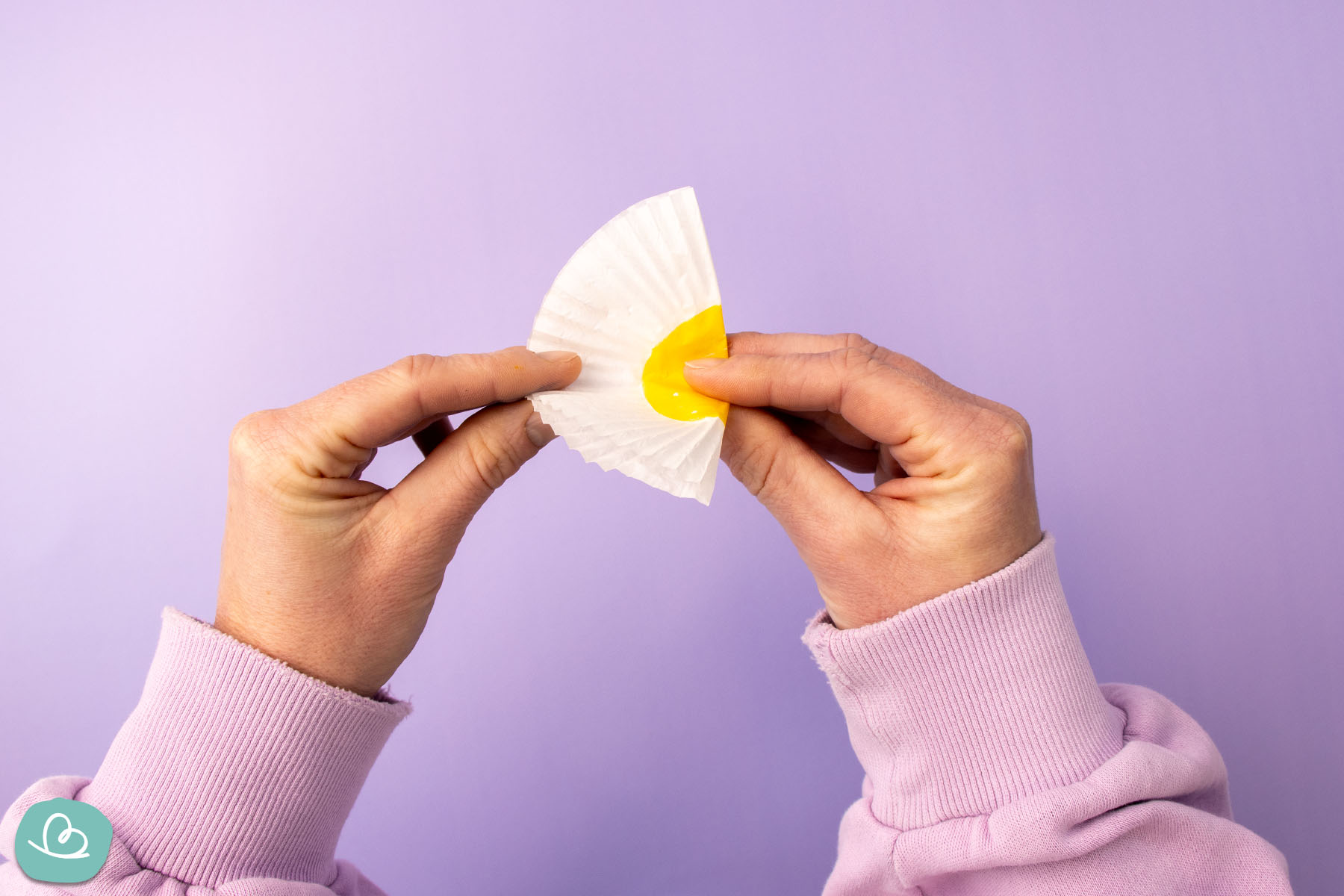 Zuerst faltest du die Förmchen auseinander und klappst die Seiten nach außen. Bemale die Mitte der Form mit einem gelben Filzstift.