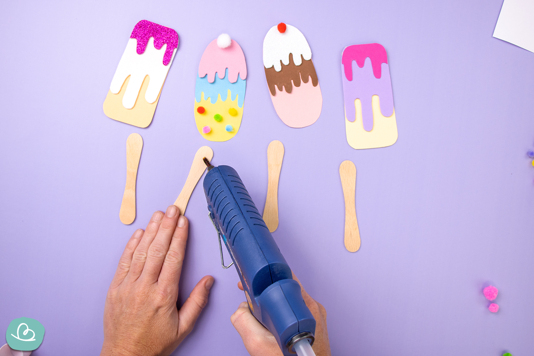 Zum Schluss klebst du das Eis auf einen Eisstiel. Fertig ist dein erstes Eis.