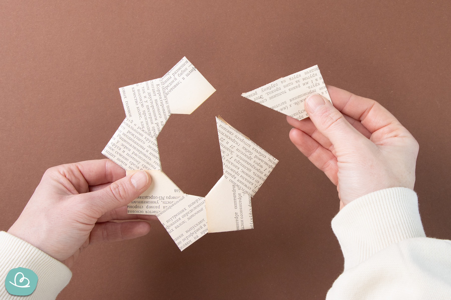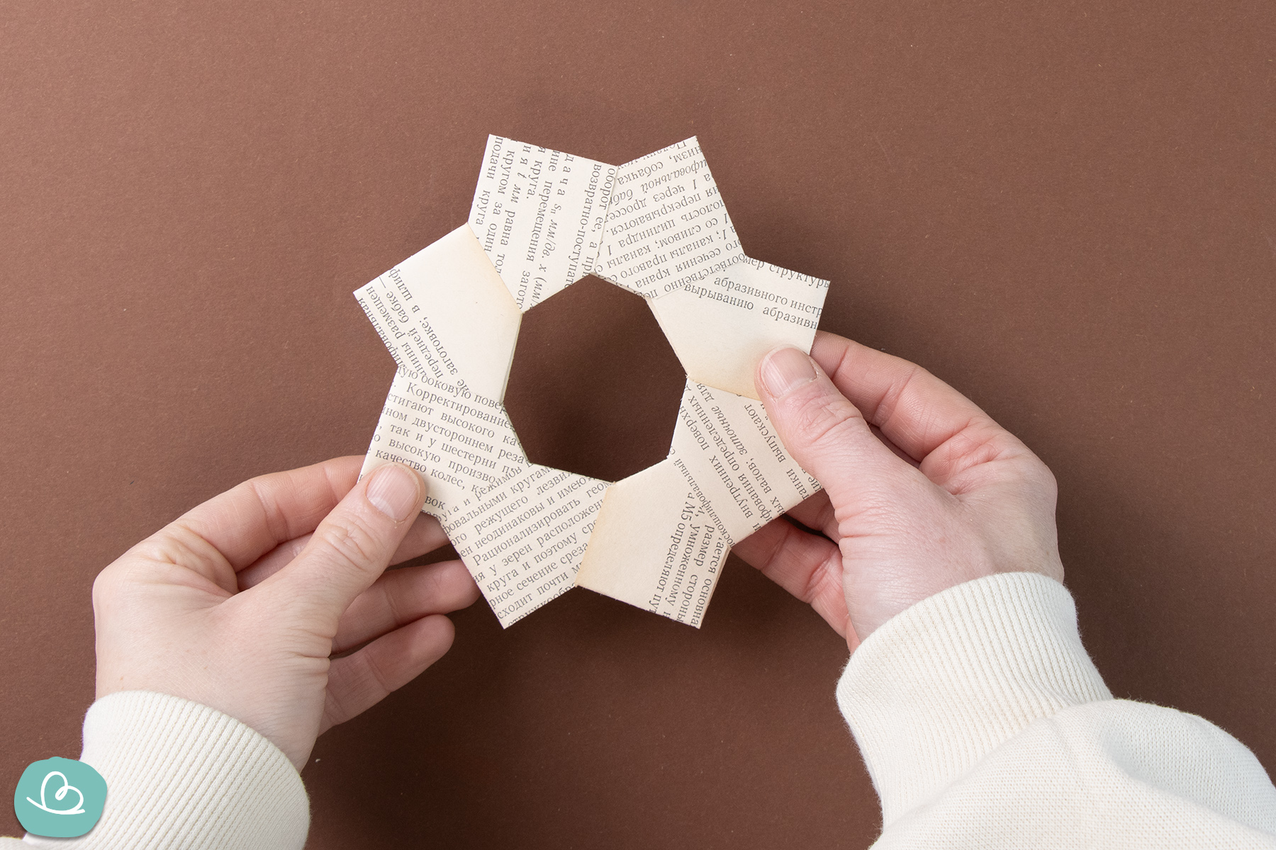 Wiederhole diesen Bastelschritt mit den restlichen Zacken. Mit dem letzten Zacken wird der Faltstern geschlossen und der Faltstern ist damit fertig.