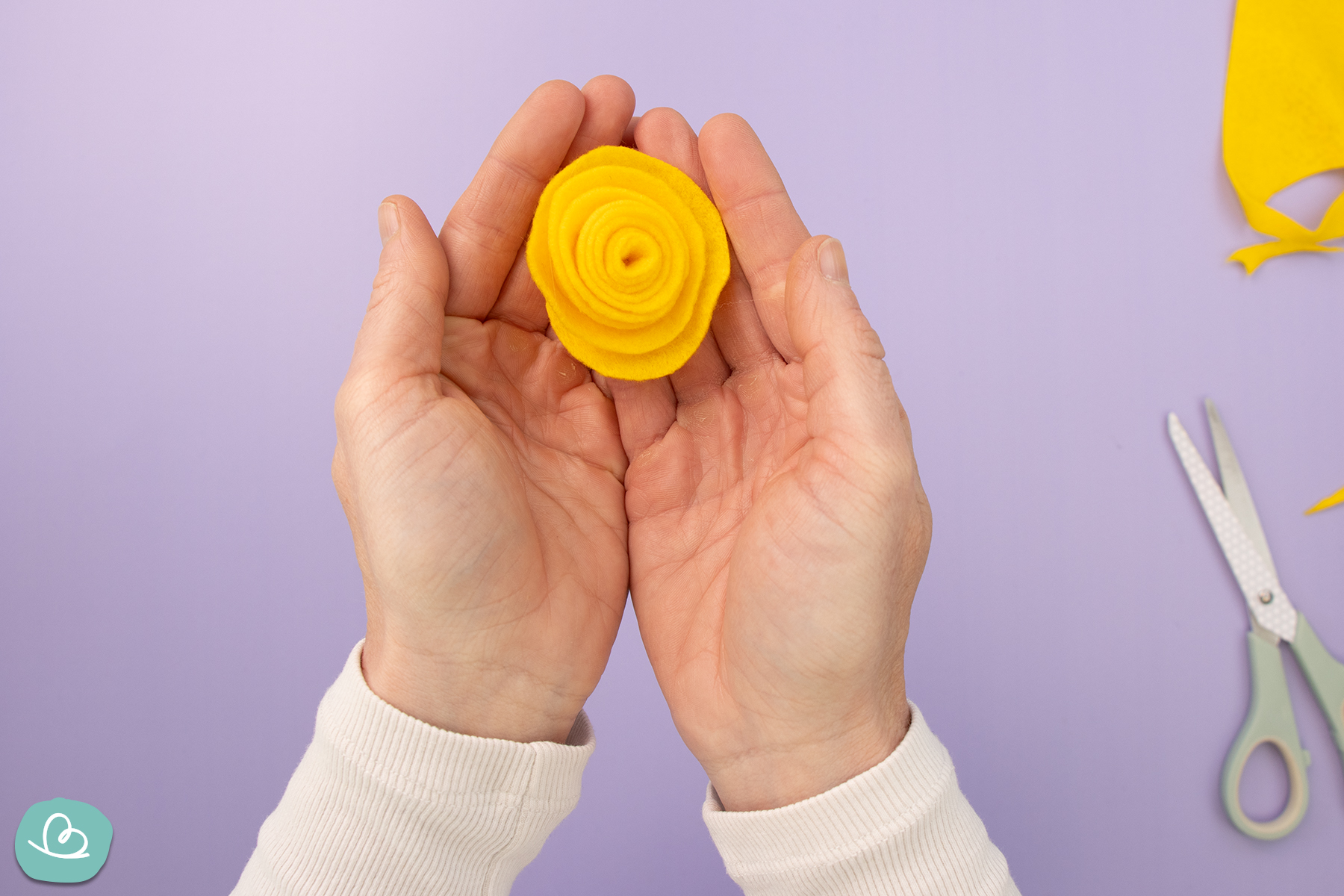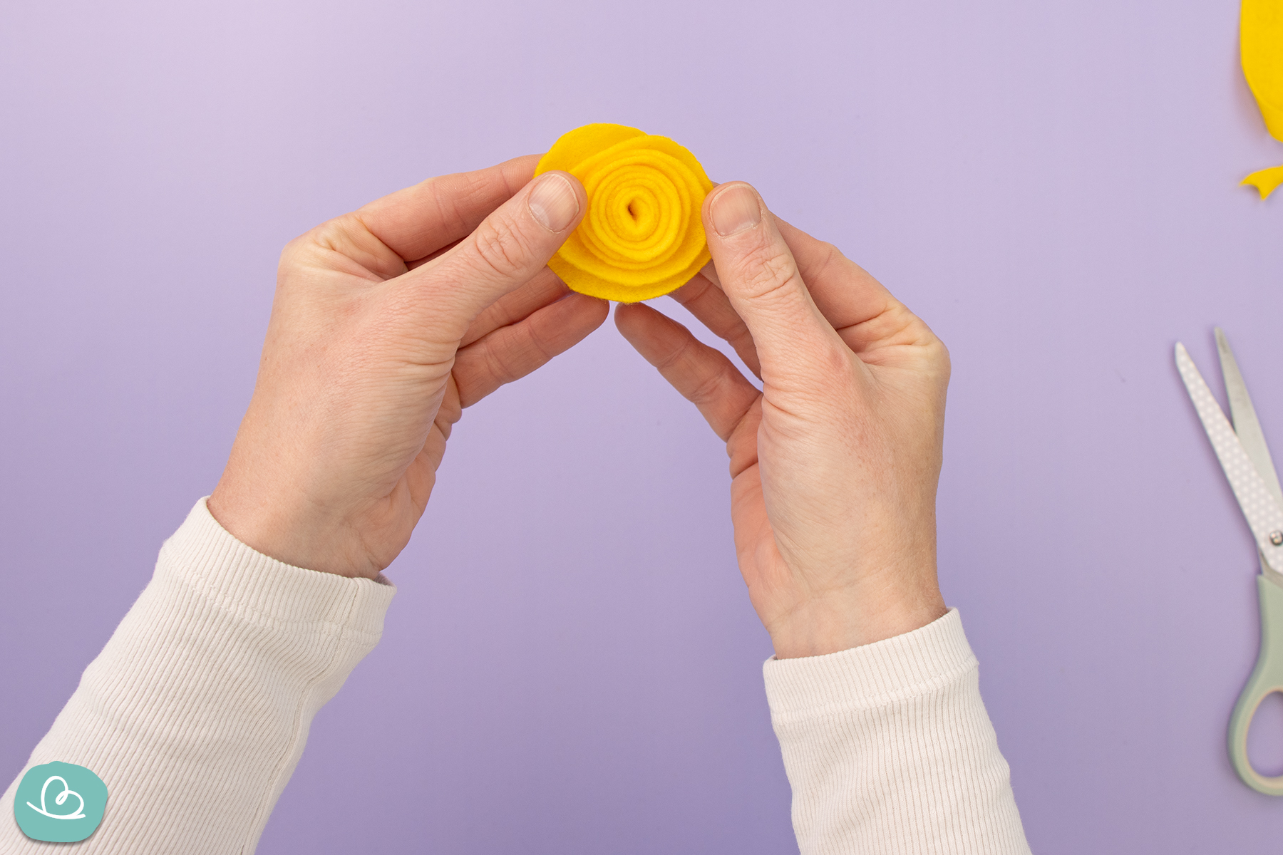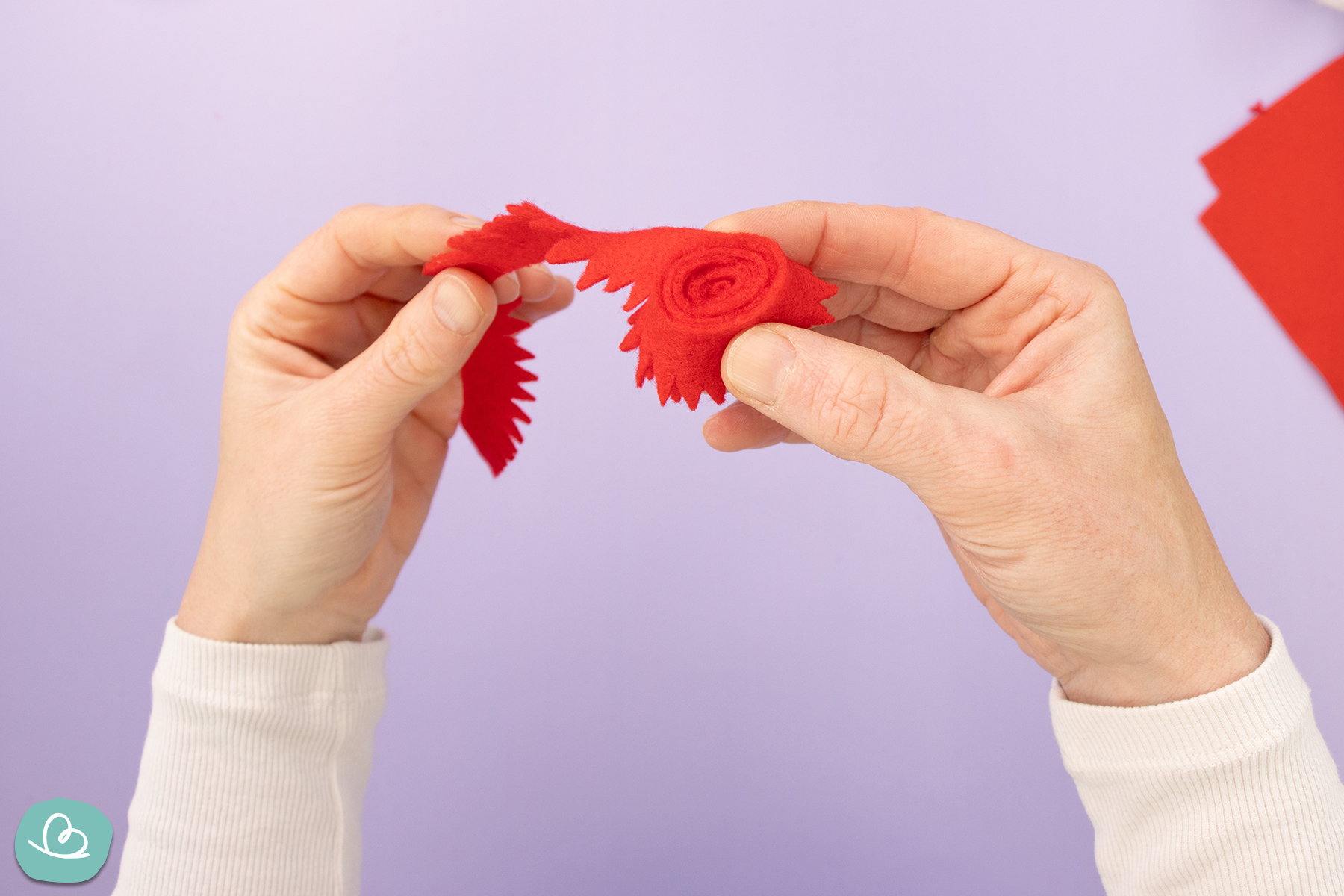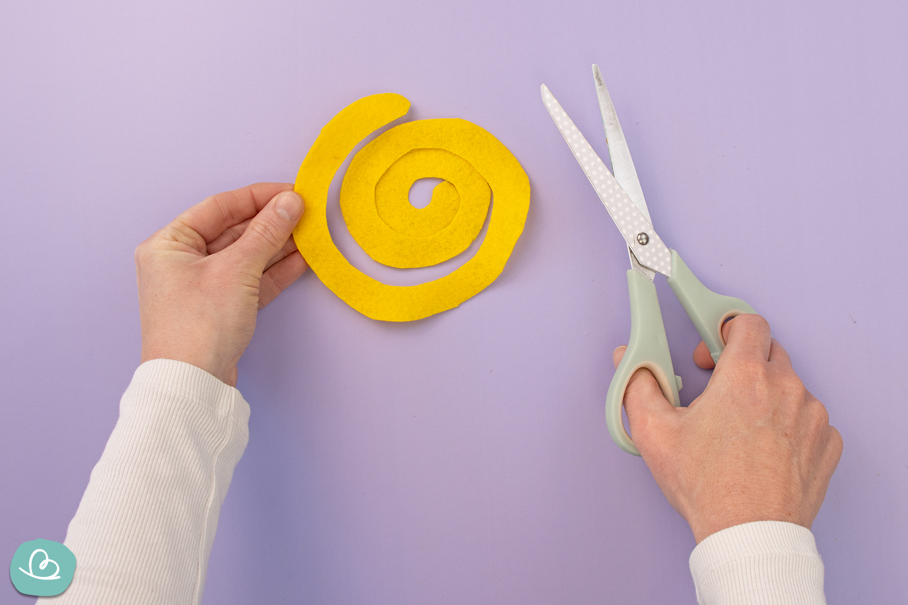 Wenn du den Rand der Spirale veränderst, erhältst du verschiedene Blumen aus Filz. Du kannst den Rand zum Beispiel im Zickzack einschneiden.