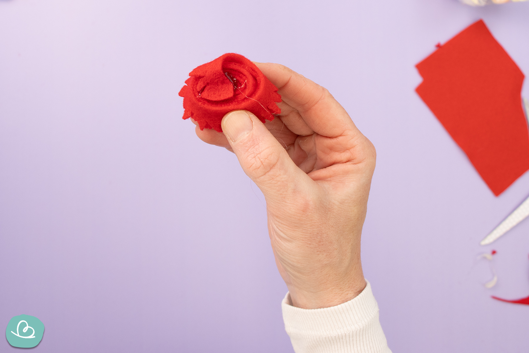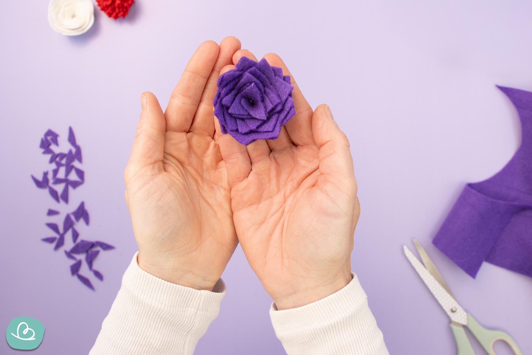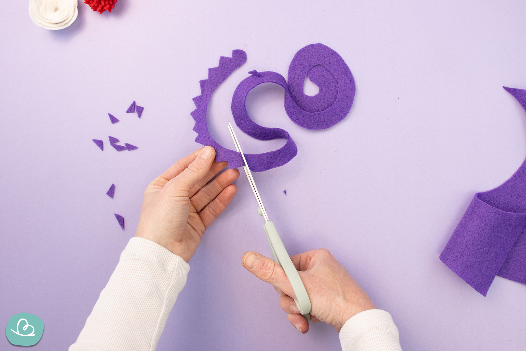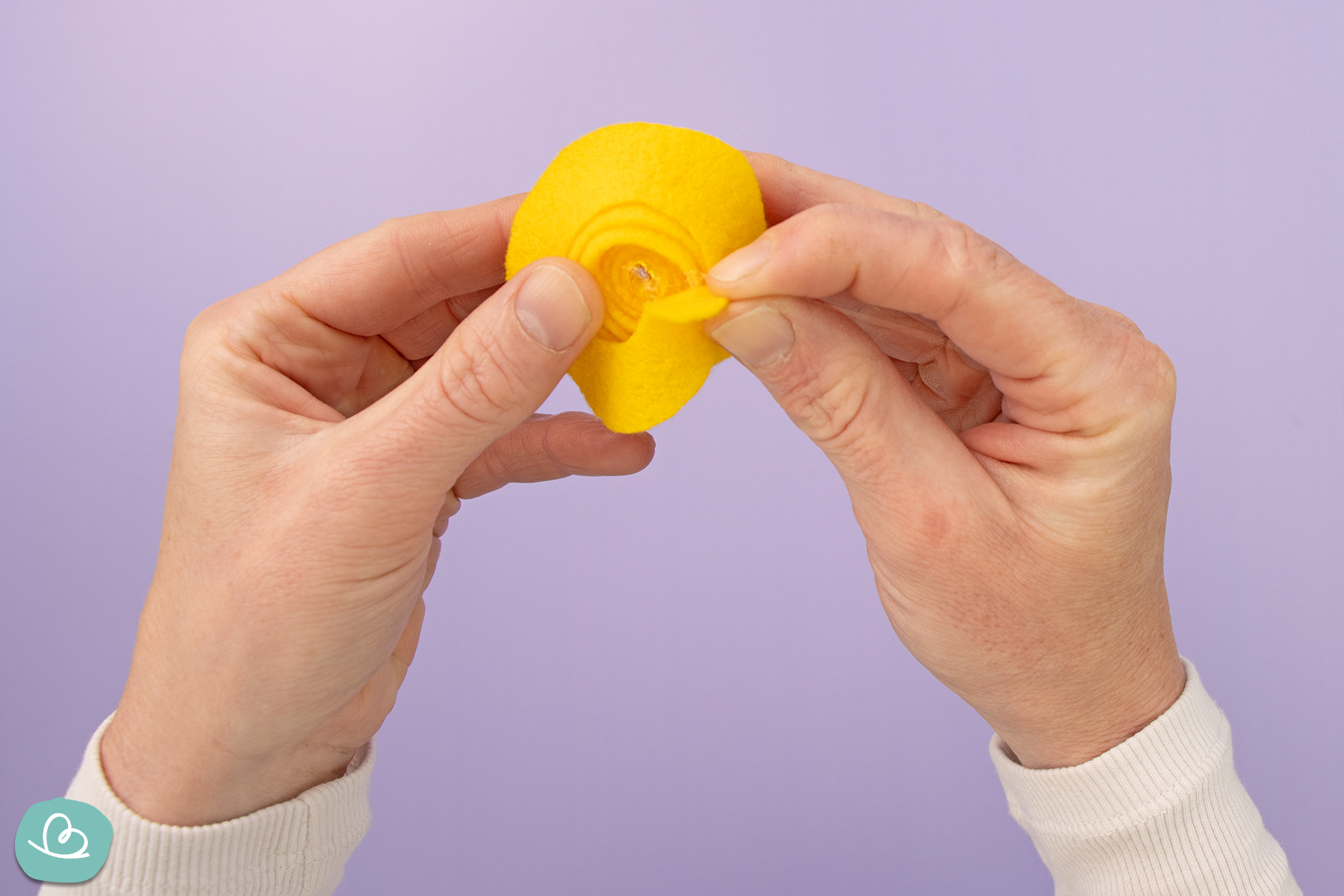 Wenn du den Rand der Spirale veränderst, erhältst du verschiedene Blumen aus Filz. Du kannst den Rand zum Beispiel im Zickzack einschneiden.