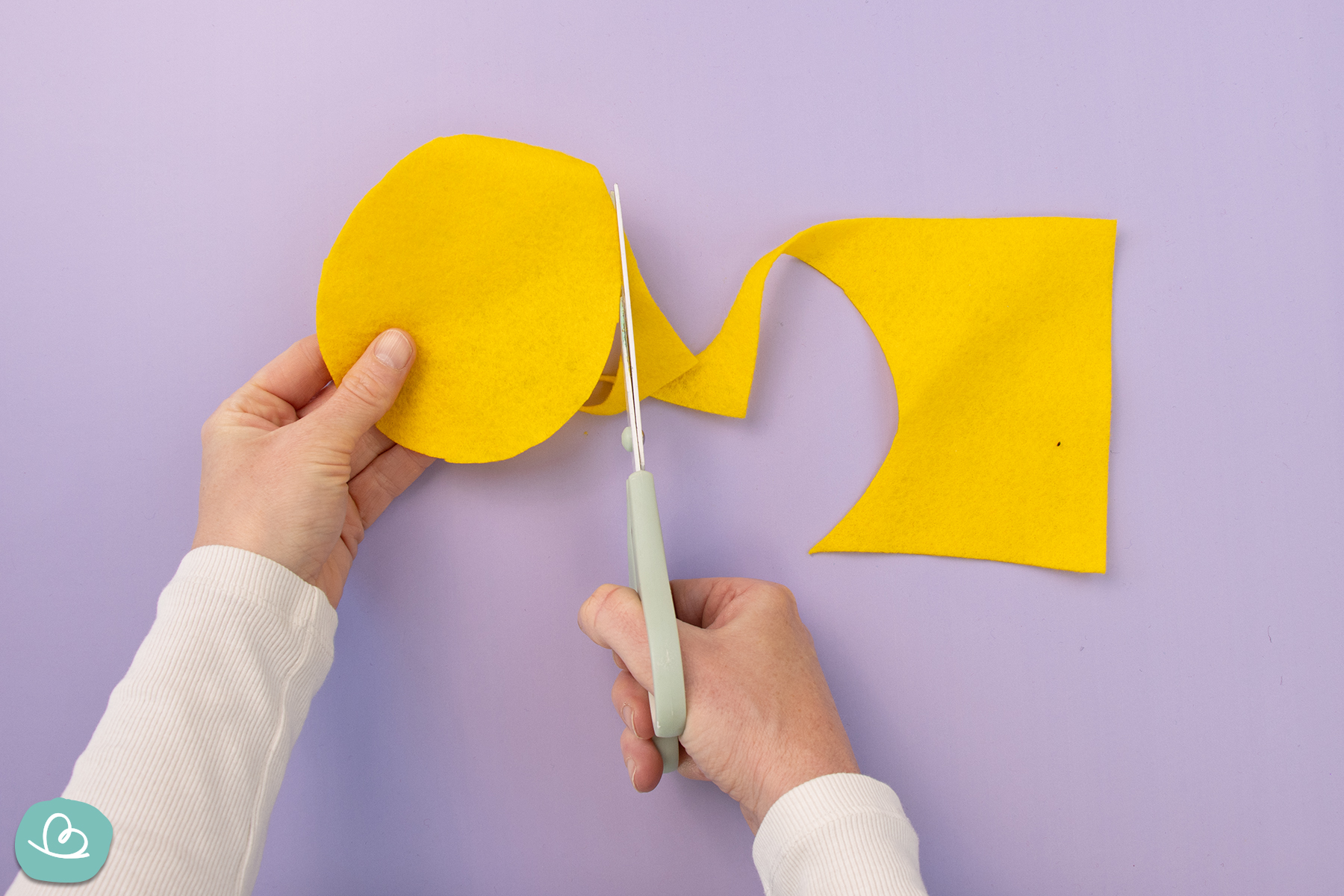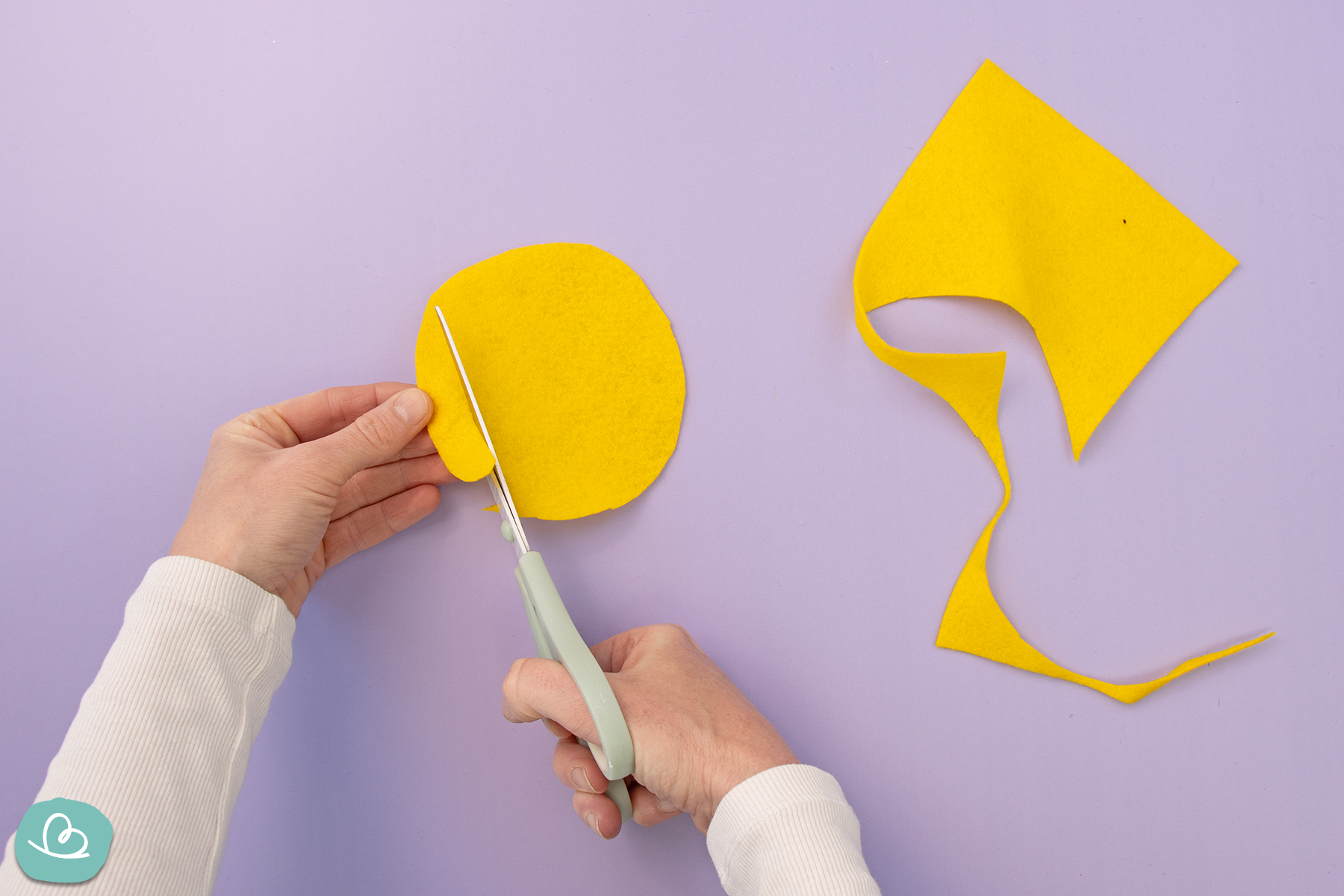 Zunächst schneidest du einen Kreis mit einem Durchmesser von ca. 10 bis 15 cm aus einem Filzbogen heraus. Je größer oder kleiner der Kreis ist, desto größer oder kleiner wird dann die Blüte aussehen.