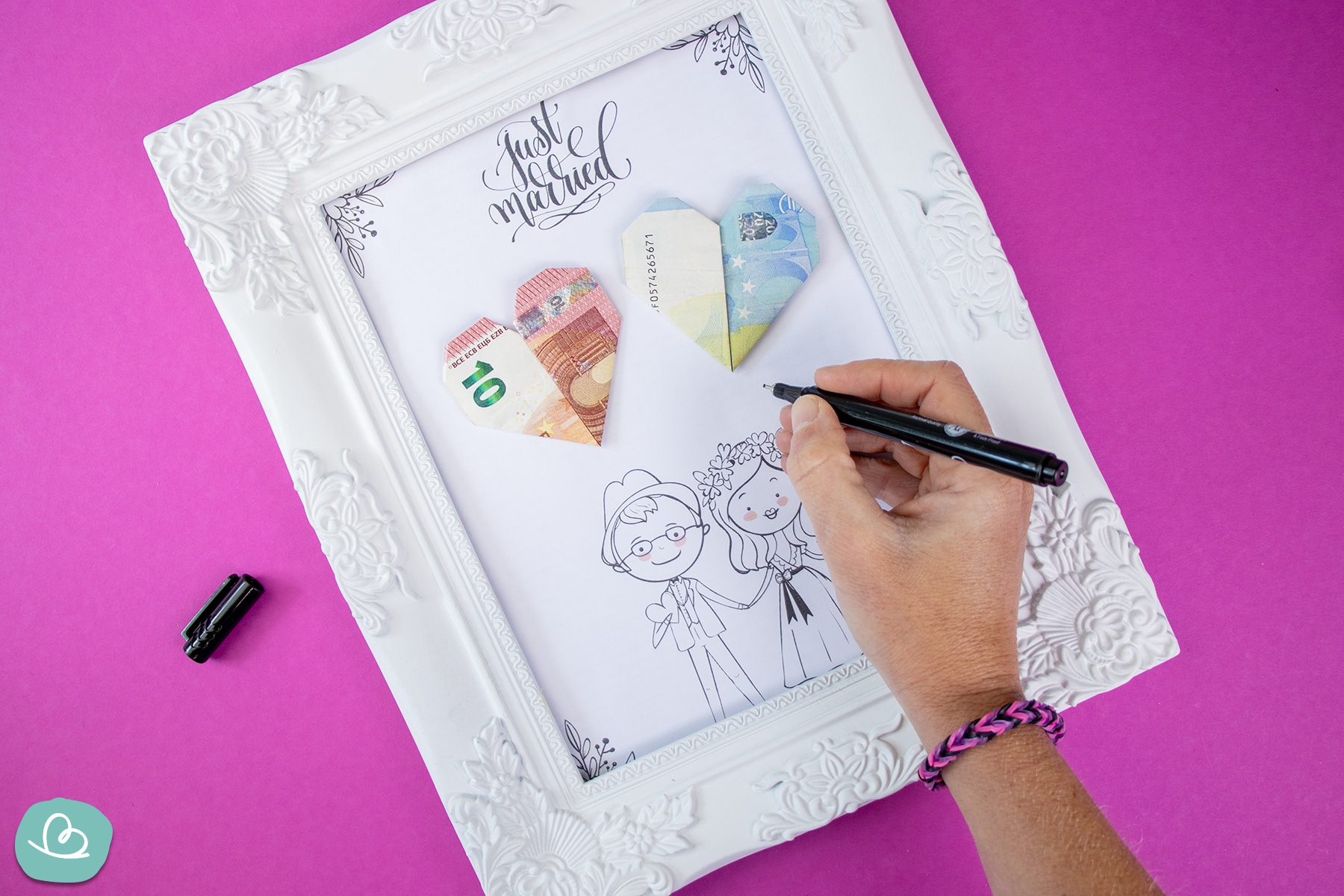 Zum Schluss werden die Geldscheinherzen mit Klebeband auf die freie Fläche geklebt und mit dem Brautpaar verbunden. Dabei wird eine dünne Linie von der unteren Spitze des Herzens zur jeweiligen Hand des Brautpaares gezogen. So werden aus den Herzen Luftballons.