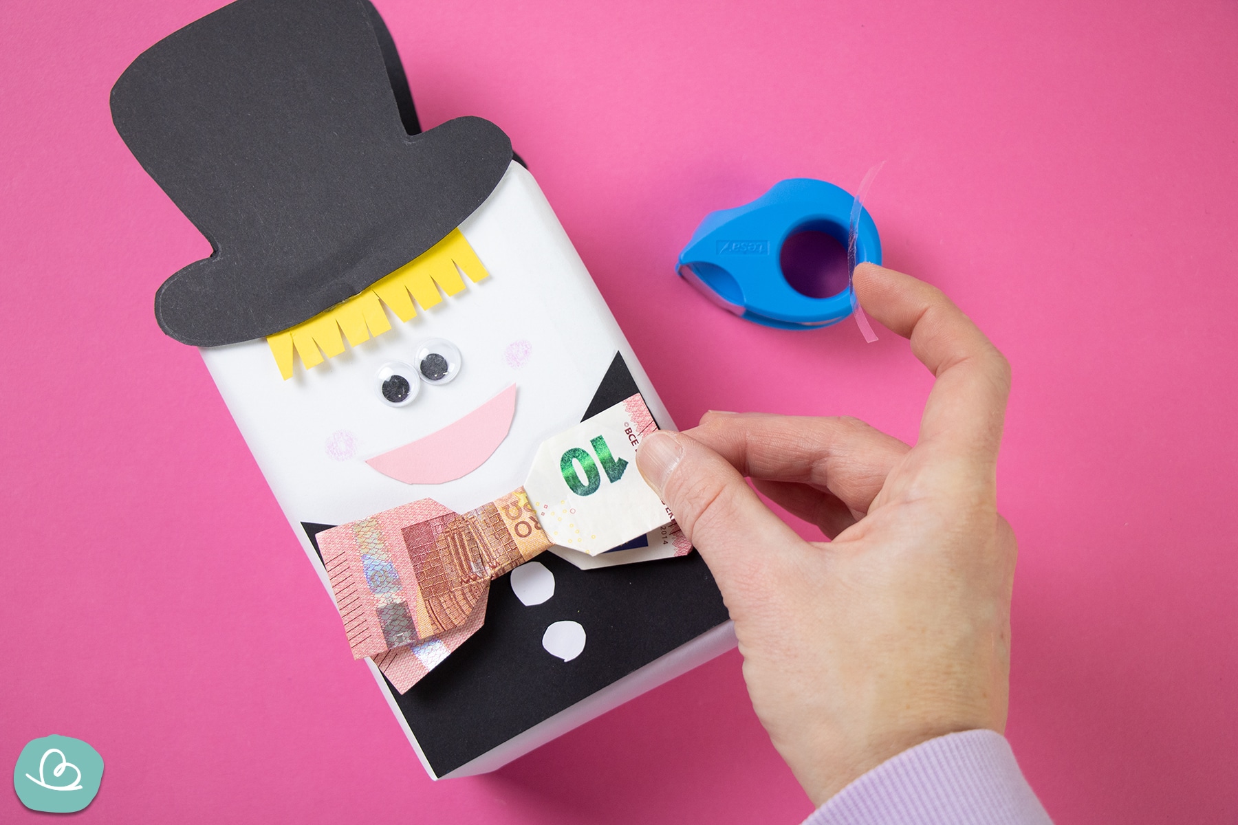 Zum Schluss wird der Gürtel mit dem Kleid aus einem Geldschein um den Karton geklebt.