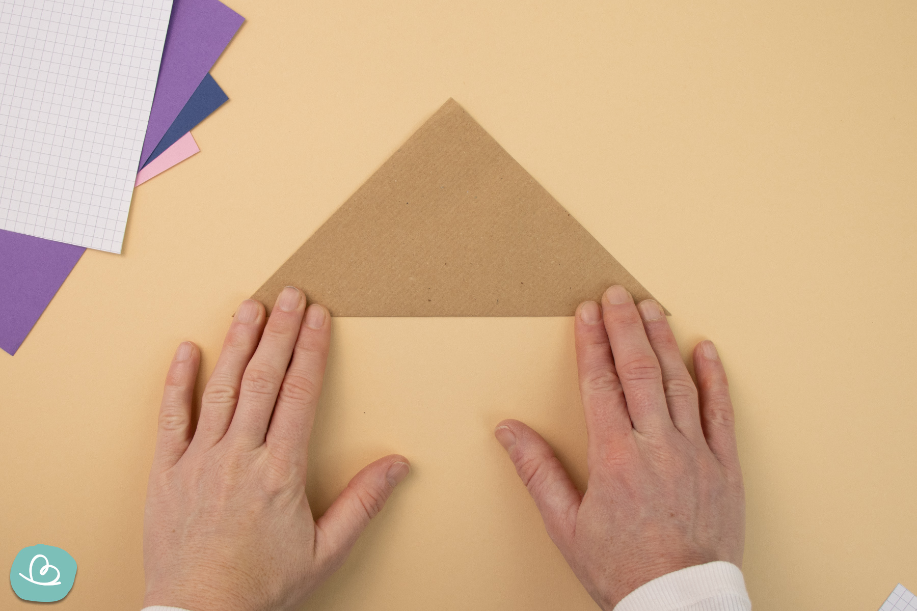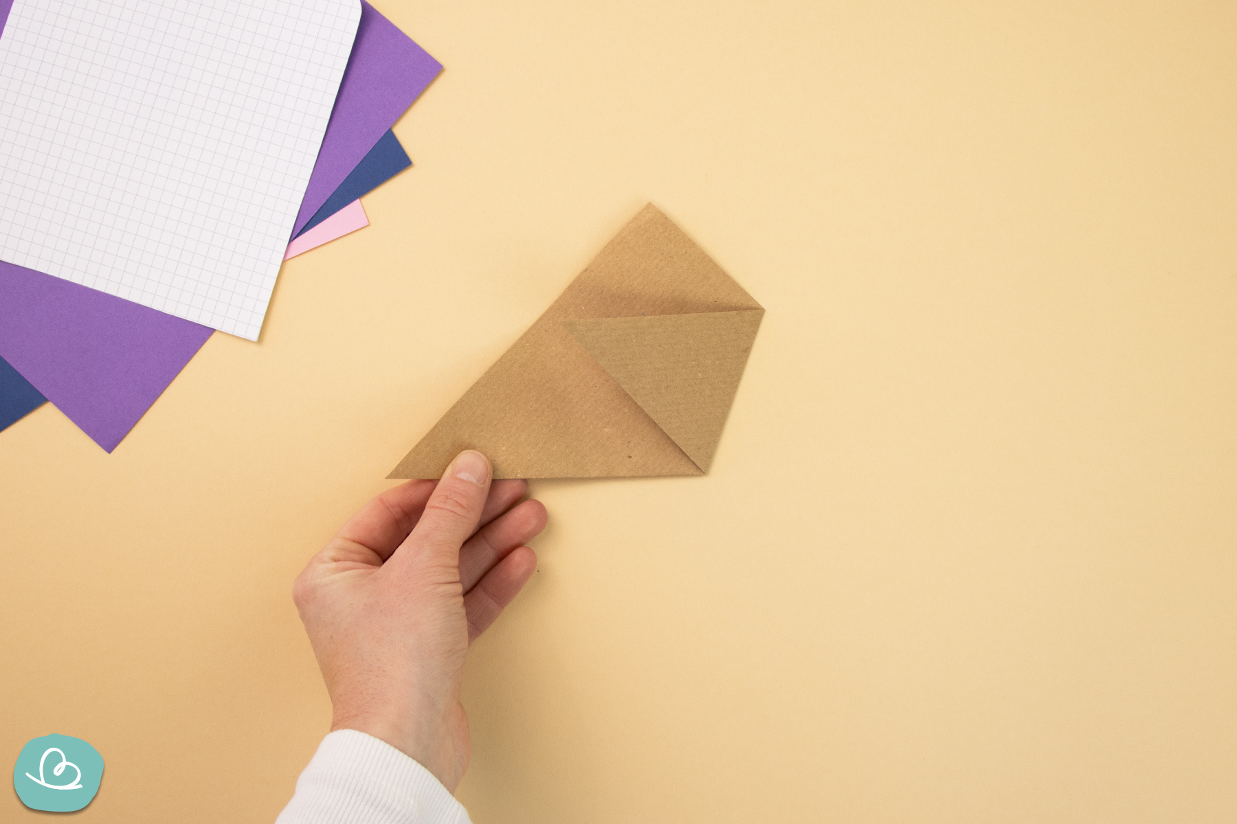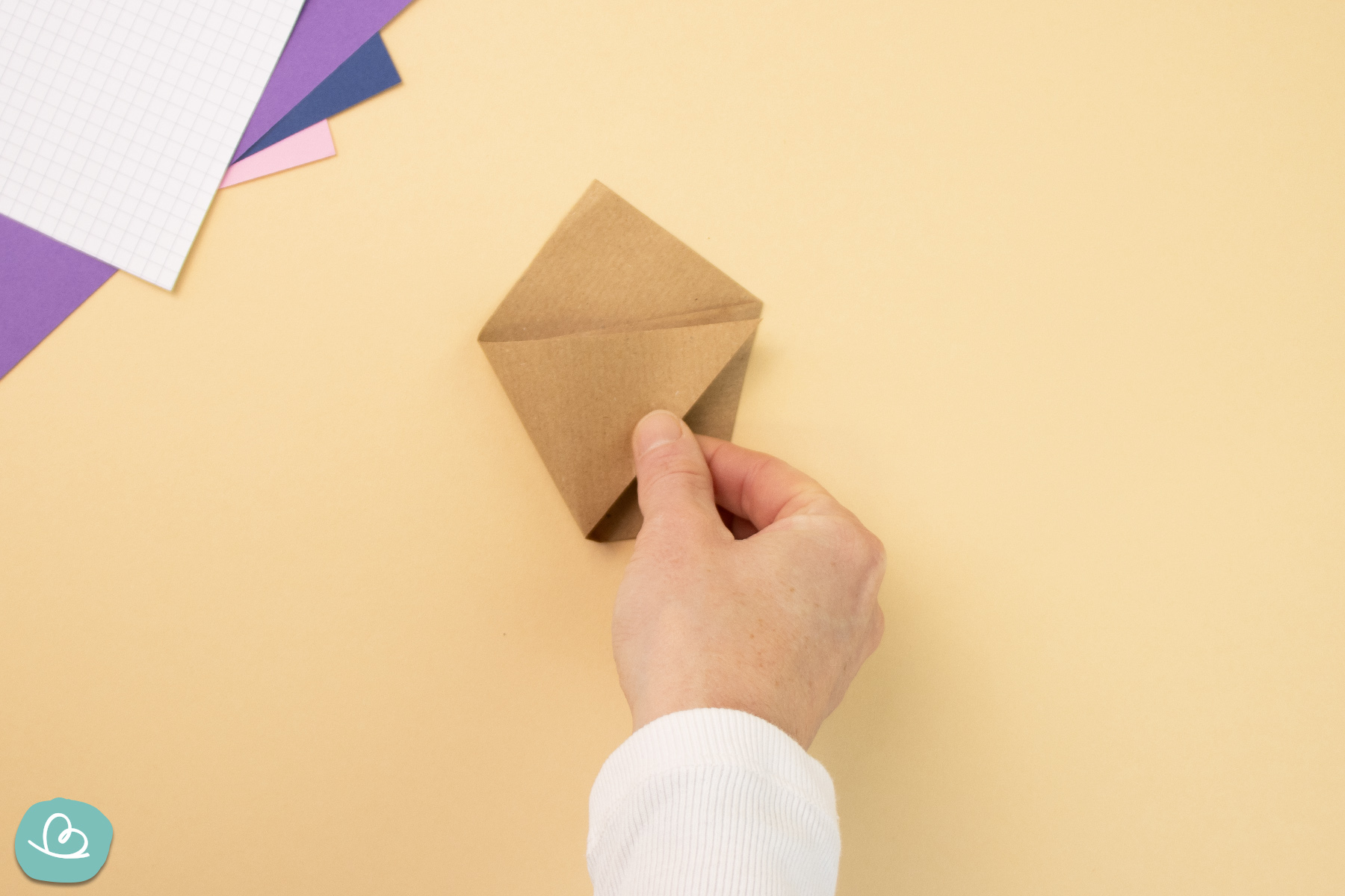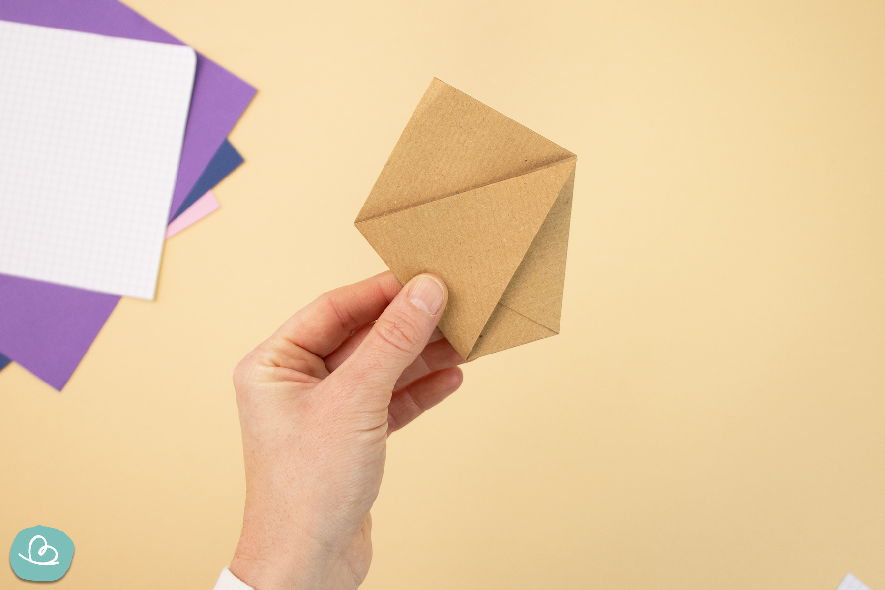 Dann falte eine der oberen Papierecken nach unten. Dadurch werden die zuvor gefalteten Ecken darunter gesichert.