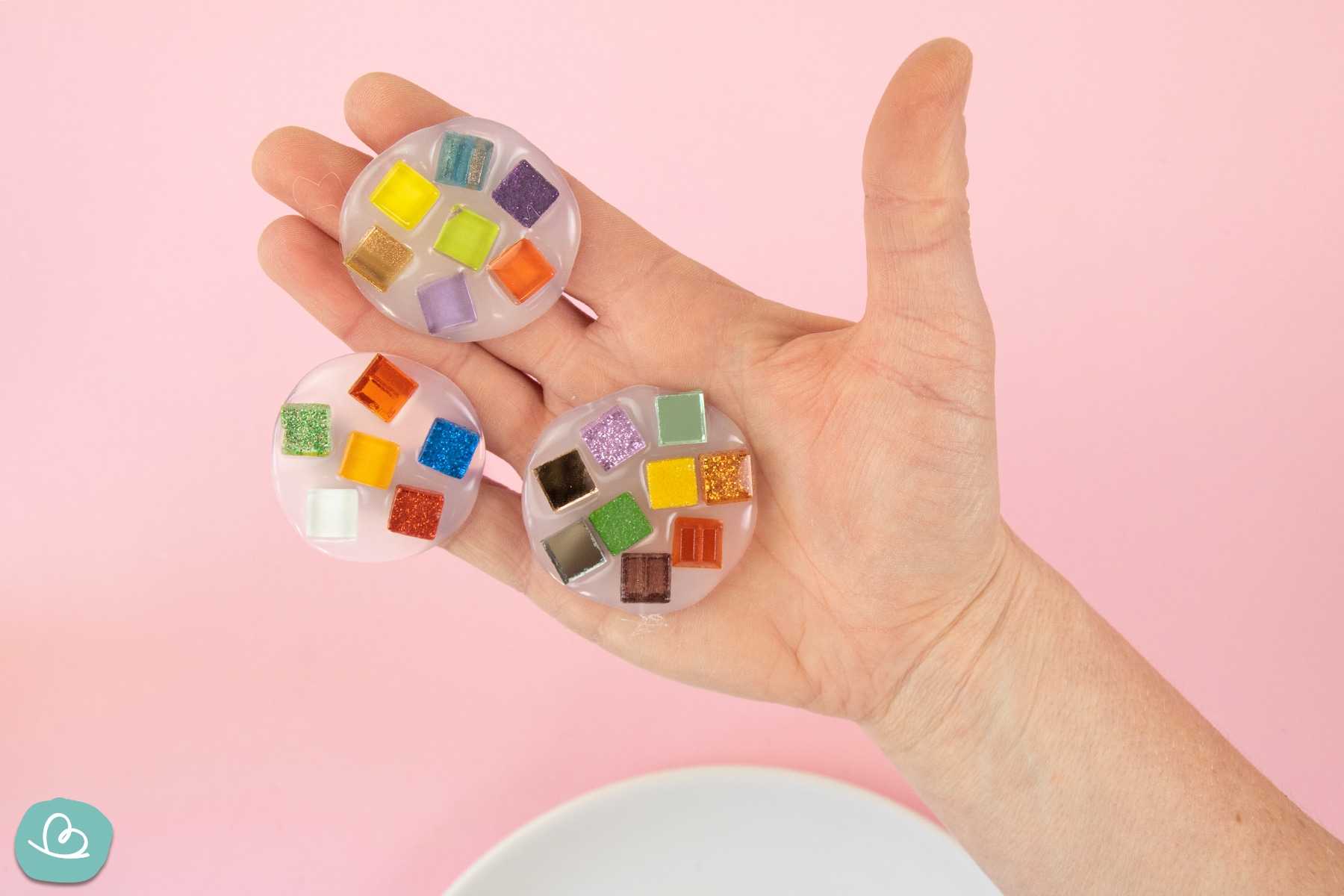 Anschließend drückst du die bunten Mosaiksteinchen in die klebrige Masse und lässt alles gut trocknen.